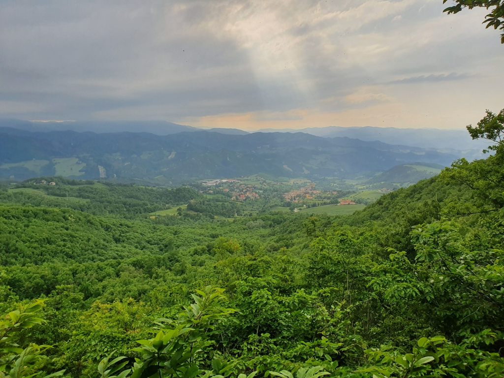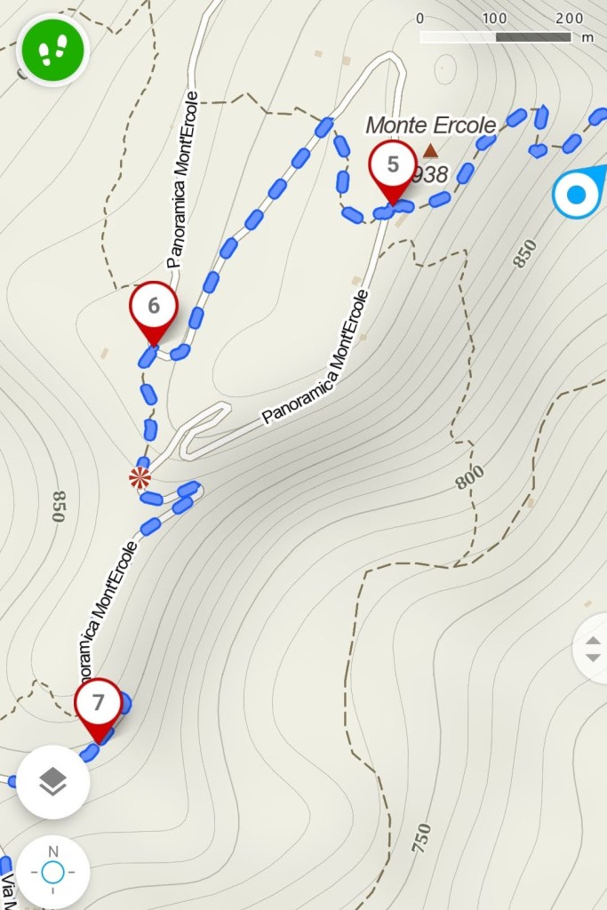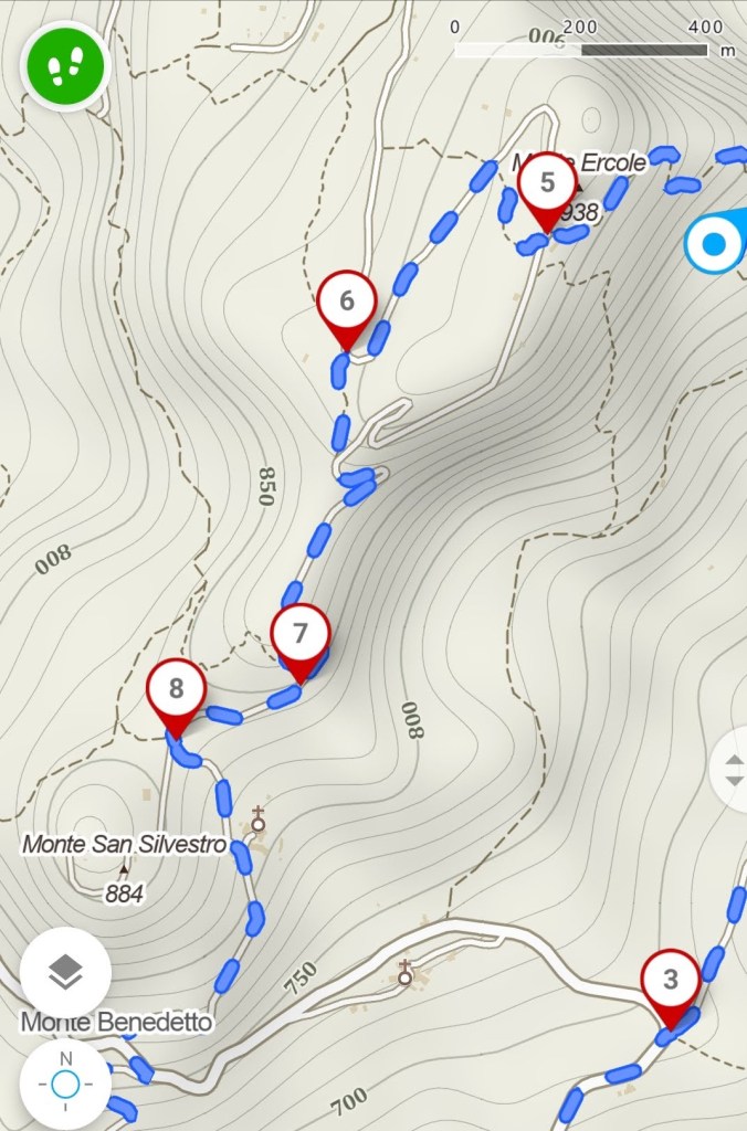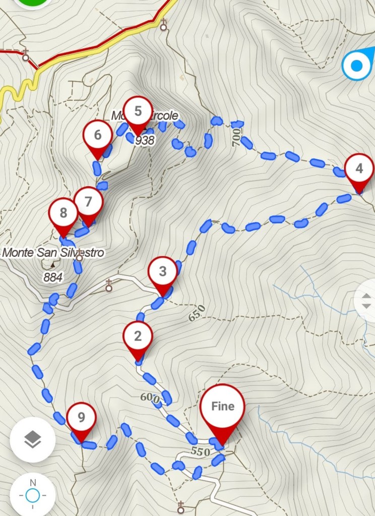Dopo poco si torna nuovamente sulla strada. Si tiene la sinistra e si scende, fino a una curva a gomito. Qui infatti si ha la possibilità di riprendere il sentiero in direzione Monte San Silvestro (ci sono addirittura due indicazioni a pochi metri di distanza!). Il sentiero nel bosco porta a un belvedere su Sant’Agata, che consigliamo assolutamente. E’ un regalo inaspettato che ci consola dalla mancanza di panorama della cima del Monte Ercole.