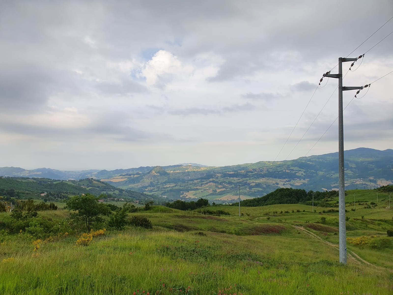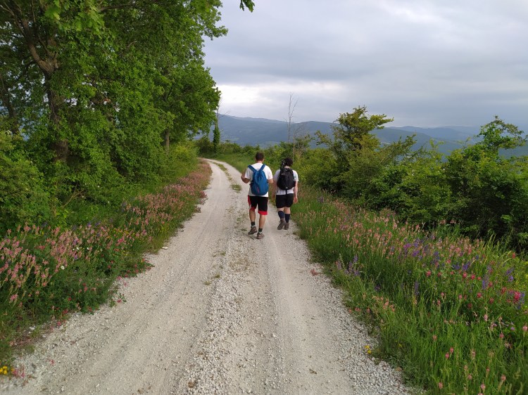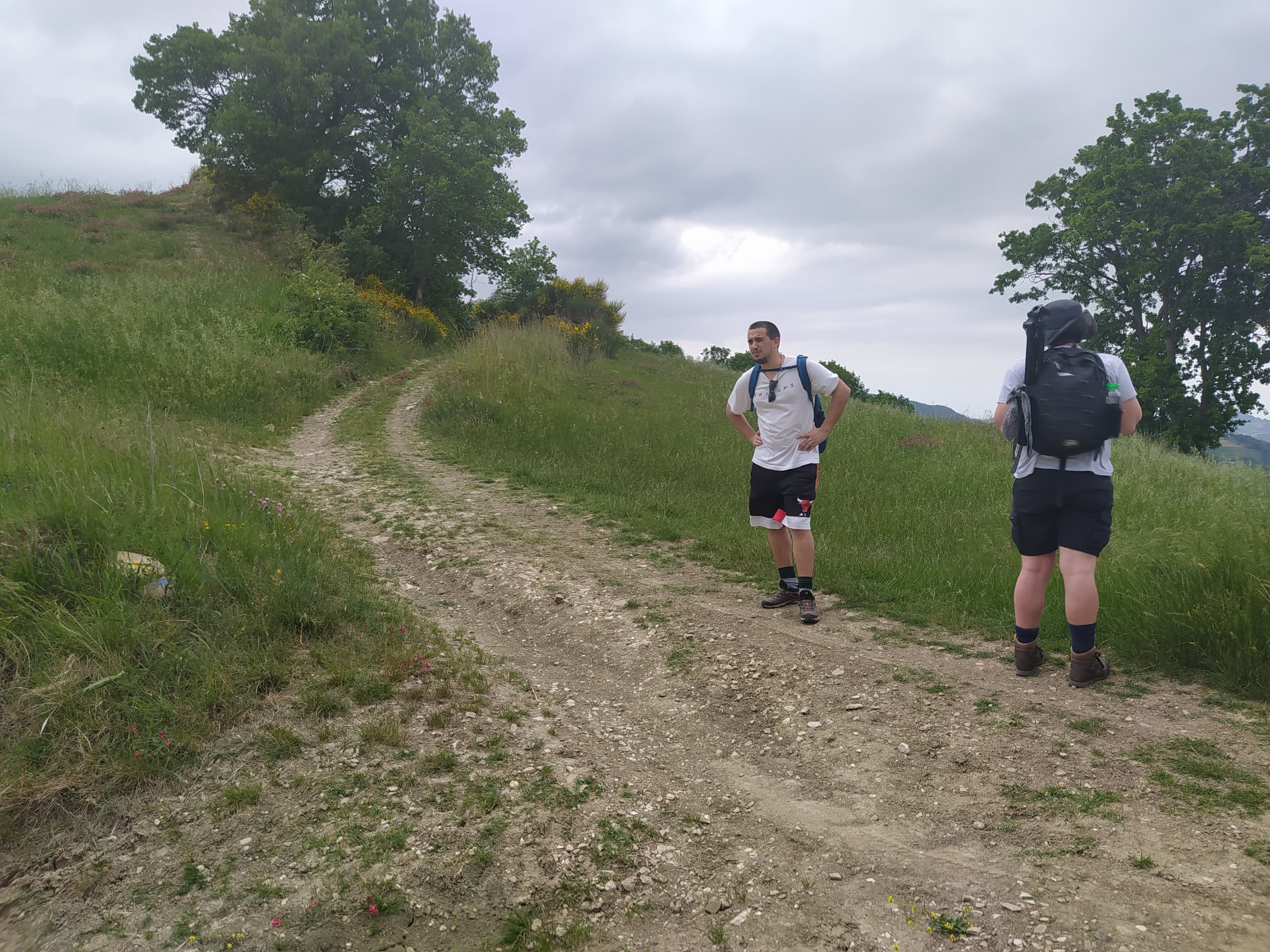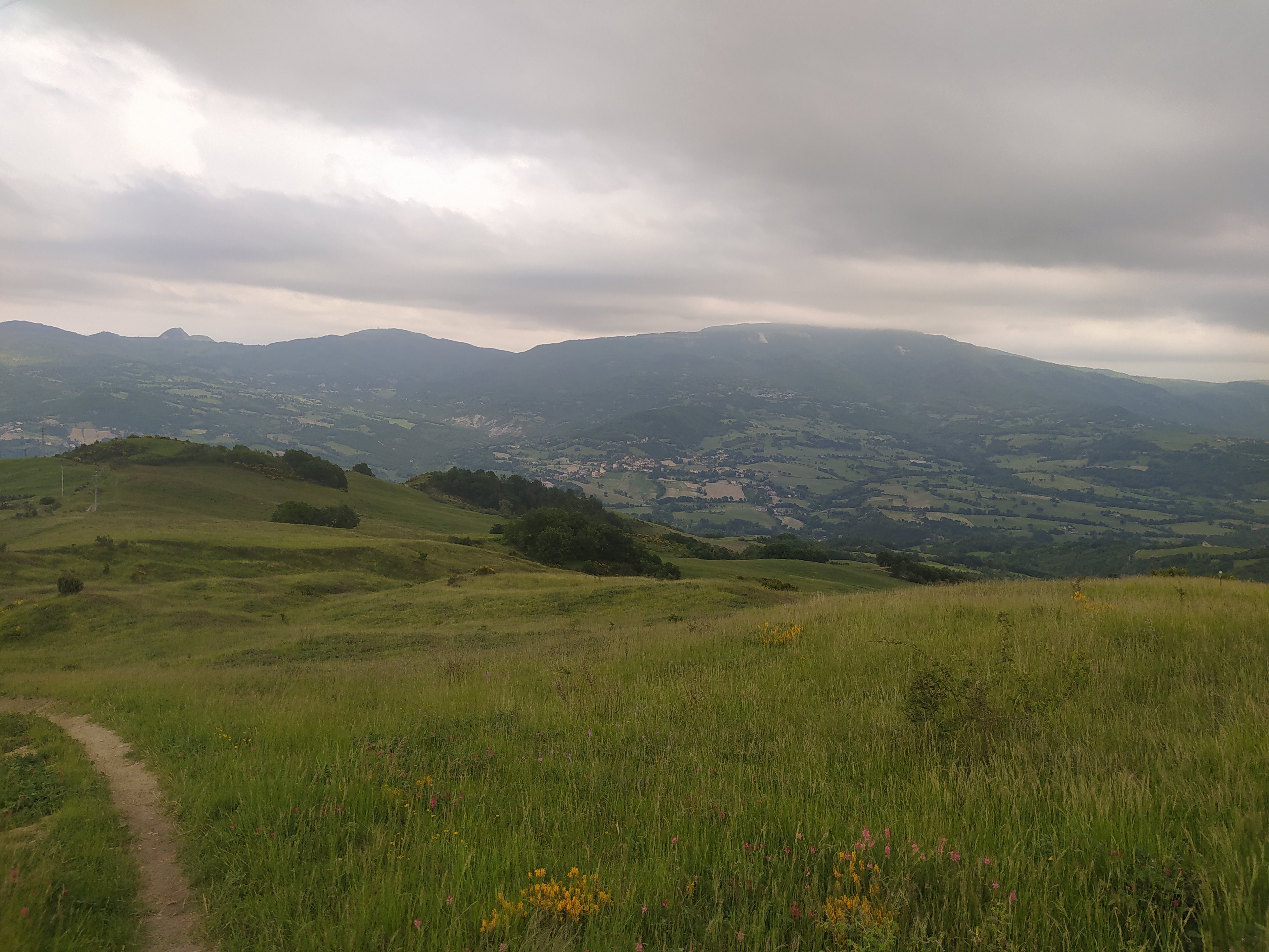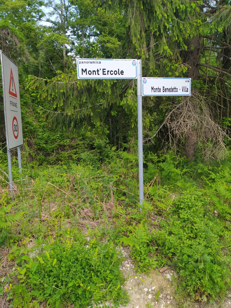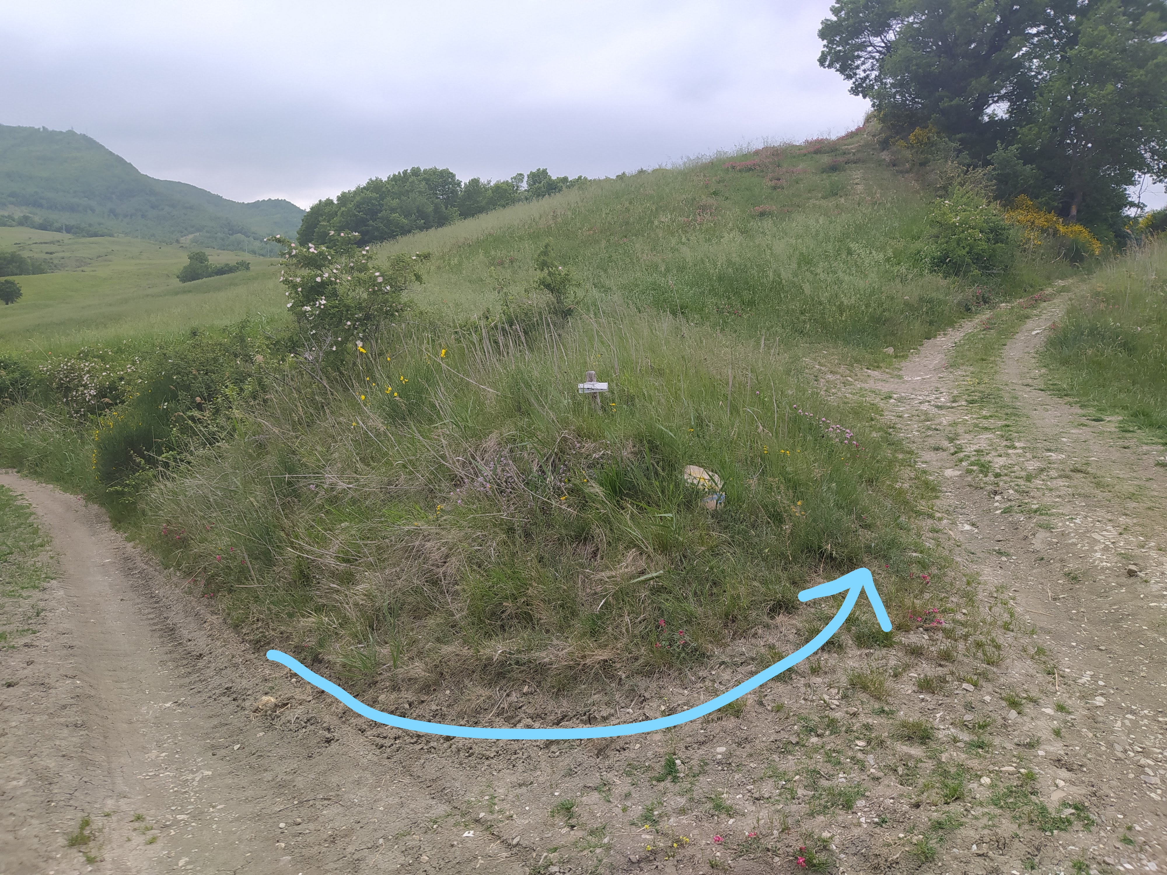 Si continua per altri venti minuti. A un certo punto la strada si biforca (foto): si mantiene la sinistra e si inizia a salire verso il Monte Ercole. In questo tratto si vede anche qualche segnale della Via di San Francesco. La vista è molto bella, perché si prende quota rimanendo ancora fuori dal bosco.