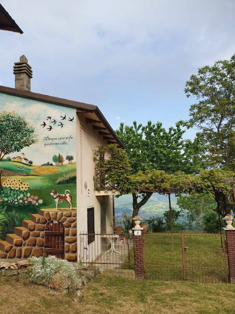 Fatta qualche foto, si scende su strada asfaltata. All’insegna riportata in figura, si ha la possibilità di deviare e salire su Monte San Silvestro. Lo snobbiamo, non sembrandoci in realtà granché e avendo poco tempo a disposizione. Continuando a scendere su strada asfaltata compaiono dei magnifici segni bianchi e rossi (sentiero CAI 099), che vanno sempre seguiti perché condurranno fino a Petrella. E’ l’unico esempio di segnaletica capillare e ben fatta che abbiamo trovato. Si arriva così a un gruppo di case colorate (foto), poi ancora tanta strada asfaltata, e infine strada sterrata. Dalla strada sterrata si vede in lontananza Rocca Pratiffi. La discesa verso Petrella è spettacolare con i colori della primavera.