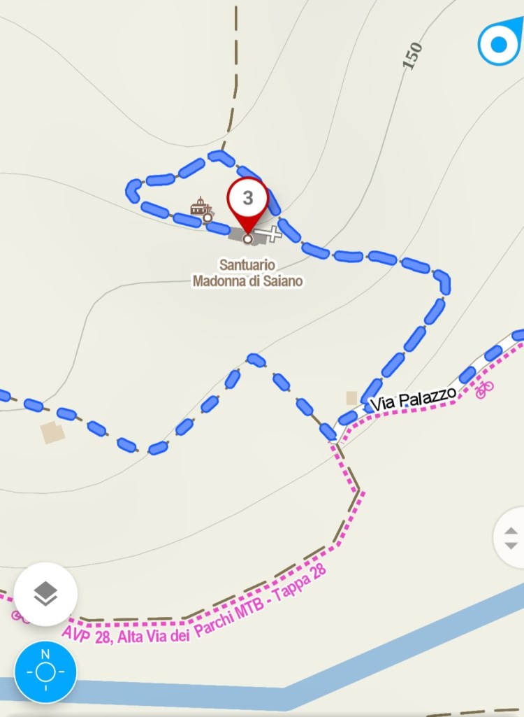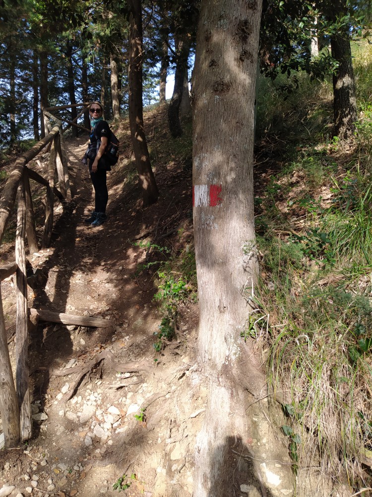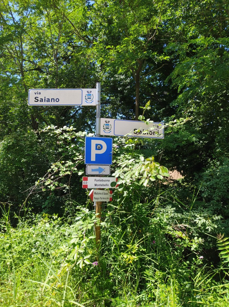Scendiamo e torniamo alla base di Saiano. Come ben segnato, prendiamo il sentiero CAI 03 verso Montebello, aggirando lo sperone roccioso da sinistra. Prendiamo dunque Via Sabioni, mentre il santuario si fa sempre più lontano.