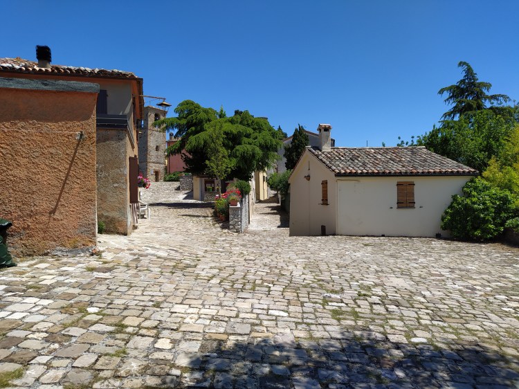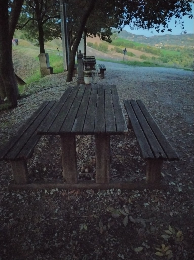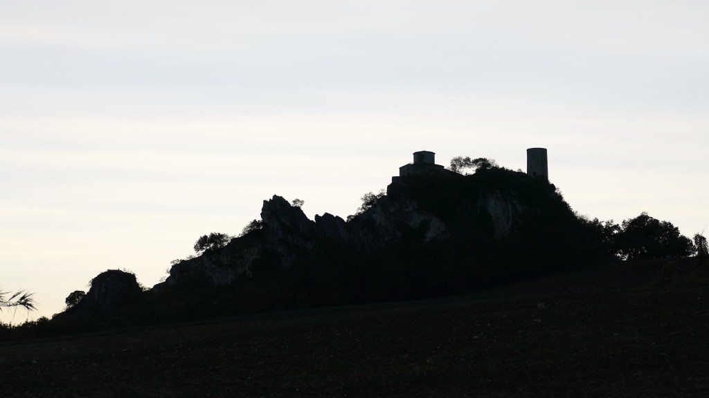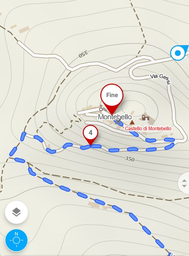 Ormai siamo arrivati: Montebello è appena sopra di noi. Troviamo dei tavoli da pic nic e, tenendo la destra, poco distante una celletta. Da qui parte una strada asfaltata, tutta dritta, che sale fino al parcheggio di fronte alla porta d’entrata della città.