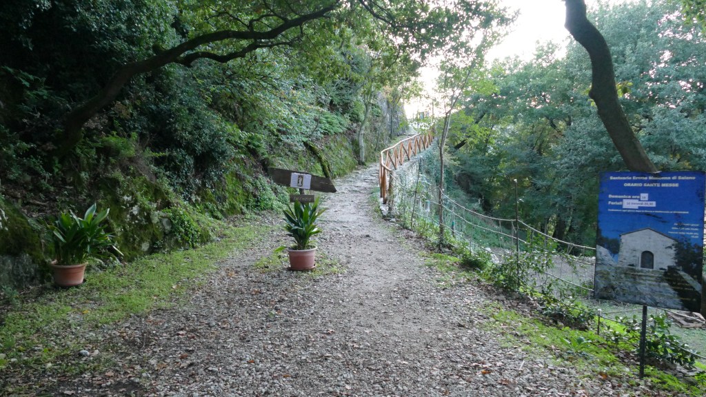 Teniamo dunque la sinistra e continuiamo a camminare su strada. Pochi minuti di asfalto e sulla destra parte la salita che porta al santuario: non si può sbagliare, è veramente un’autostrada che ha inizio da una grande croce bianca. Dalla base di Saiano partono anche numerosi vicoli e sentierini che salgono fra la boscaglia e si ricongiungono con quello principale.