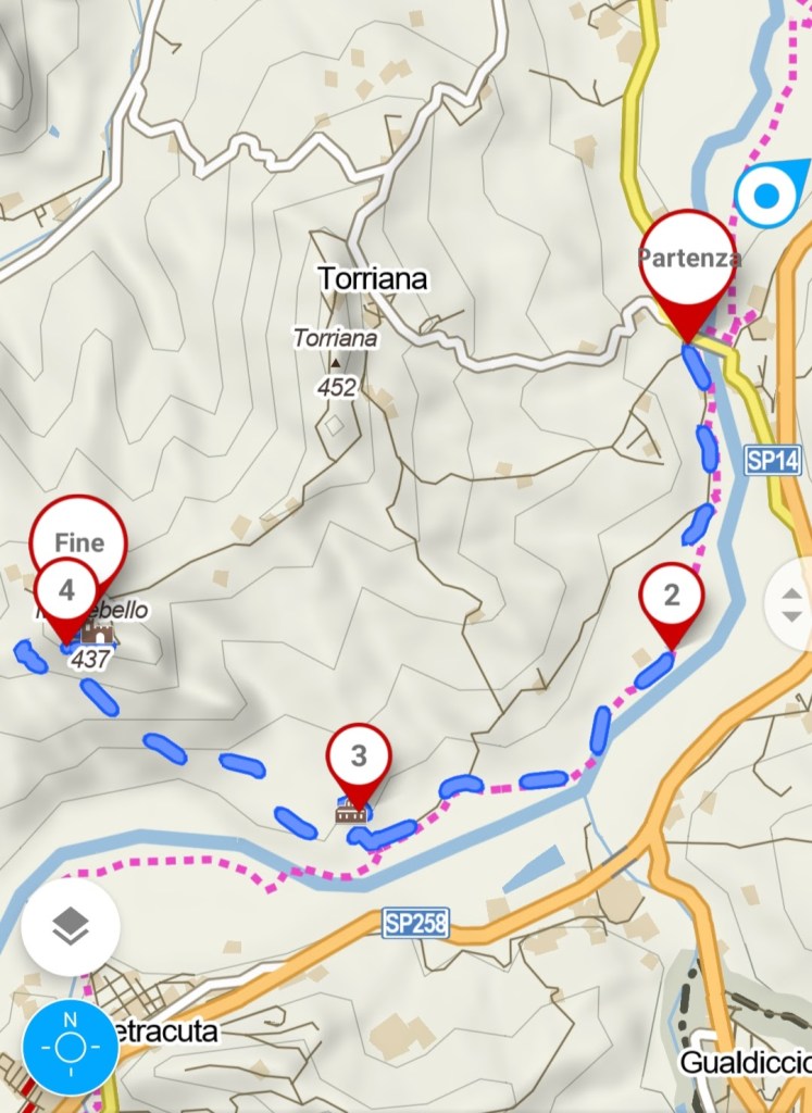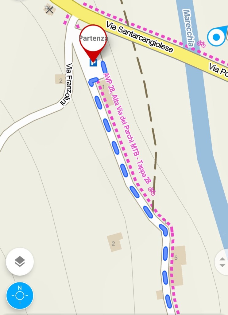 Il trekking ha inizio nel parcheggio di fronte al panificio Marecchia, appena dopo il ponte. Prendiamo dunque via Palazzo, che costeggia il fiume. Troviamo subito una fontana, ottima per chi si è scordato di riempire la borraccia.