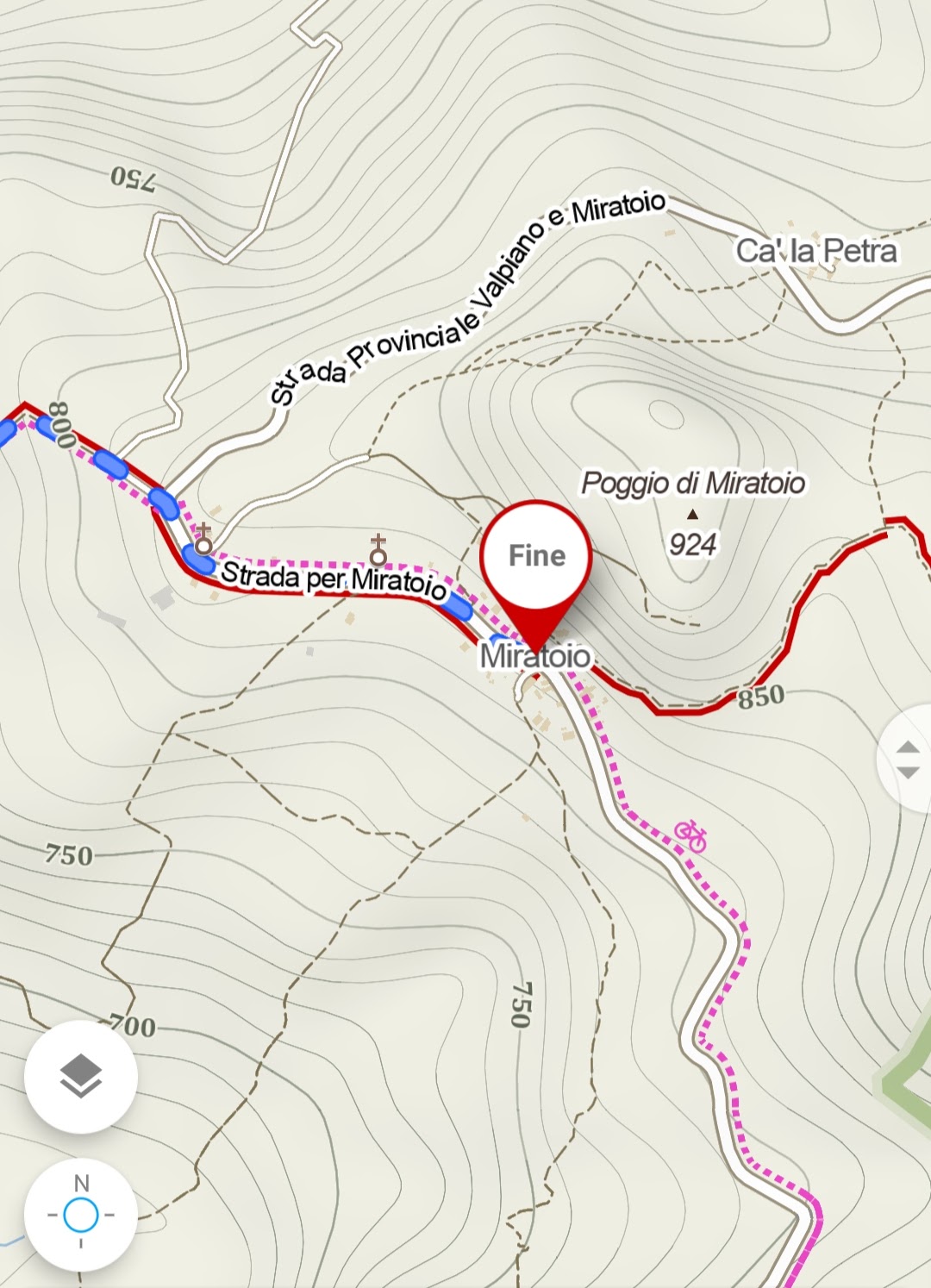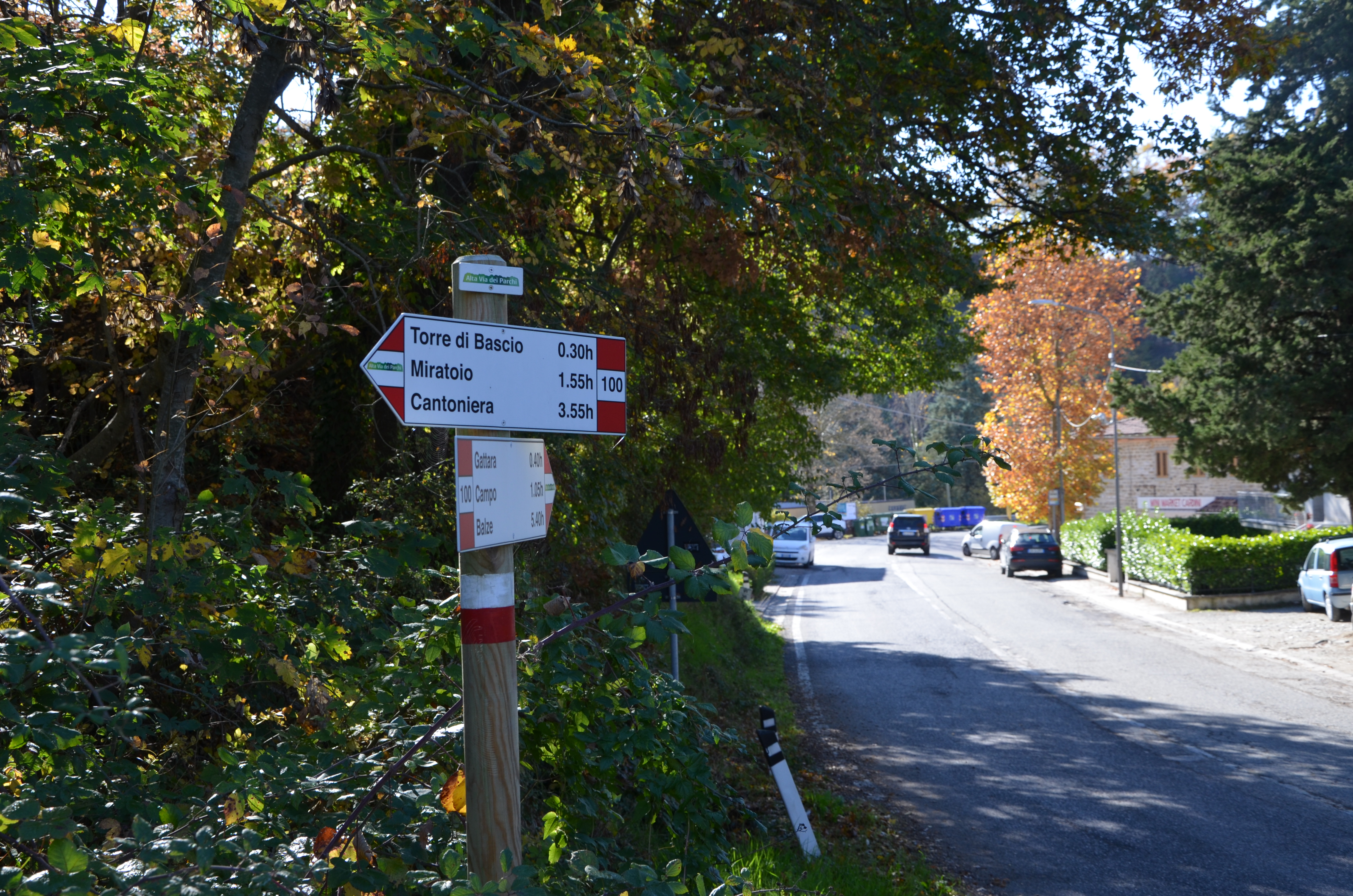 Il sentiero, all’ombra del bosco, è in costante salita. Camminiamo così un buon quarto d’ora fino a quando il sentiero esce dal bosco e si immette su strada. Teniamo la sinistra e in poco tempo arriviamo a Miratoio.