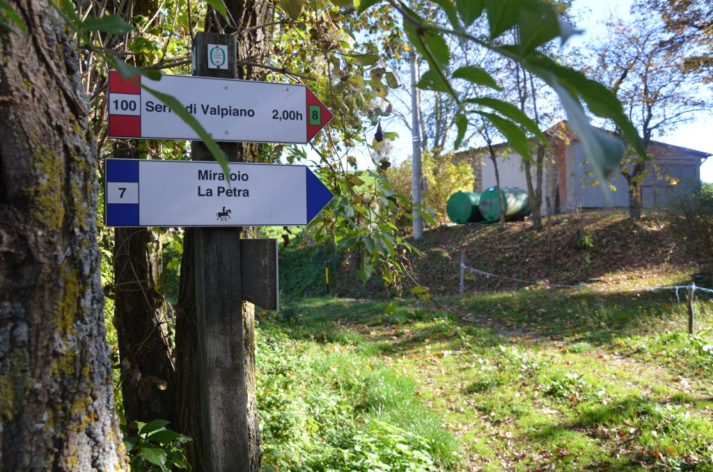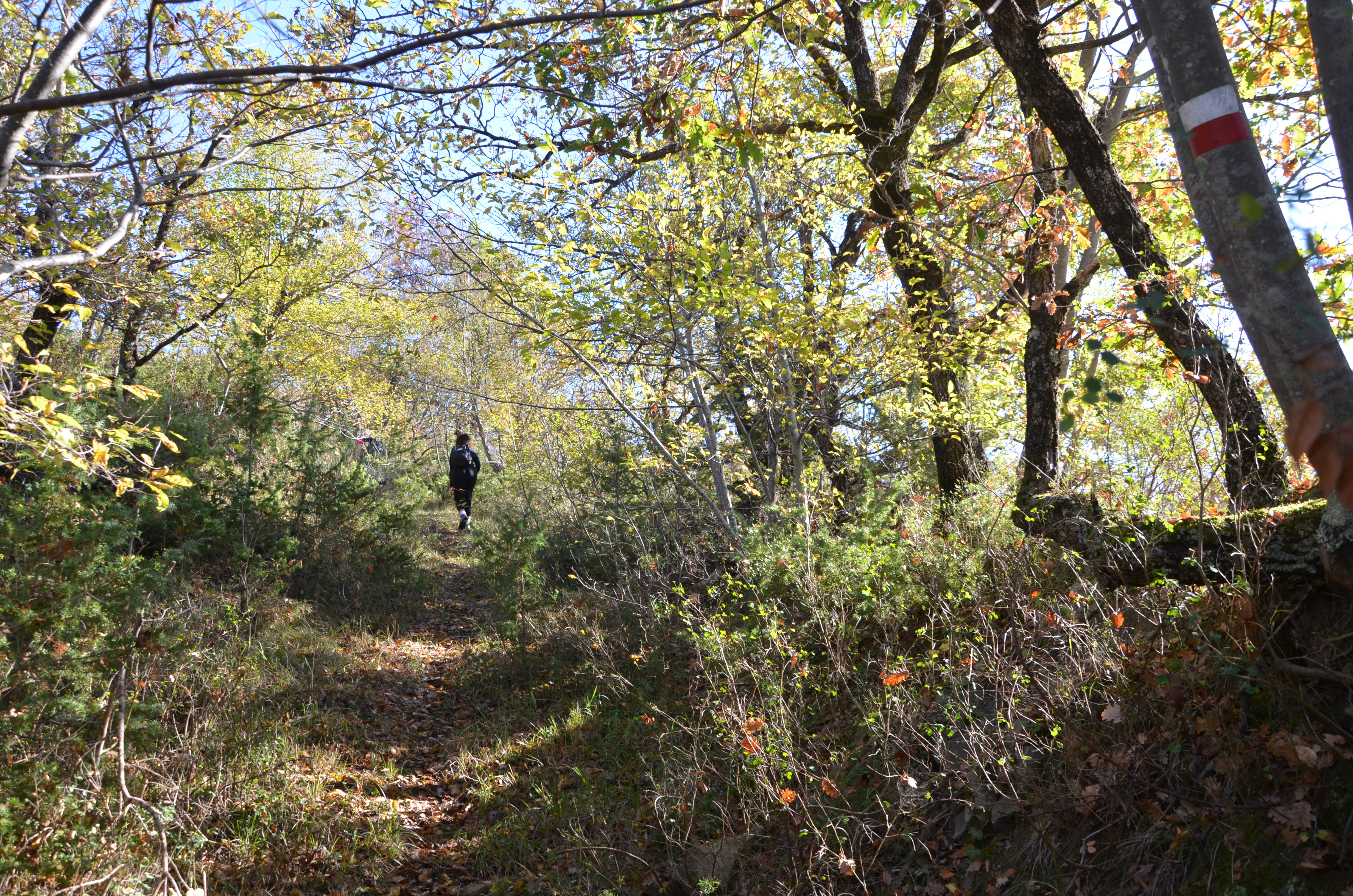 L’imbocco del sentiero verso Miratoio non è immediatamente visibile: percorrendo la Strada Marecchiese da monte a valle il sentiero parte sulla destra. Seguiamo dunque il CAI 100 o la segnaletica dell’Alta Via dei Parchi (AVP), che coincidono. D’ora in poi ci aspetta una mezz’ora all’interno del bosco, costantemente in salita. La vegetazione può essere fitta ma non c’è da preoccuparsi: i segni bianchi e rossi non mancano.