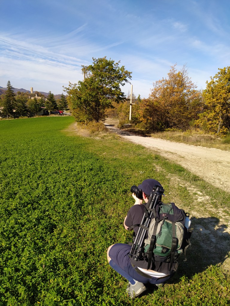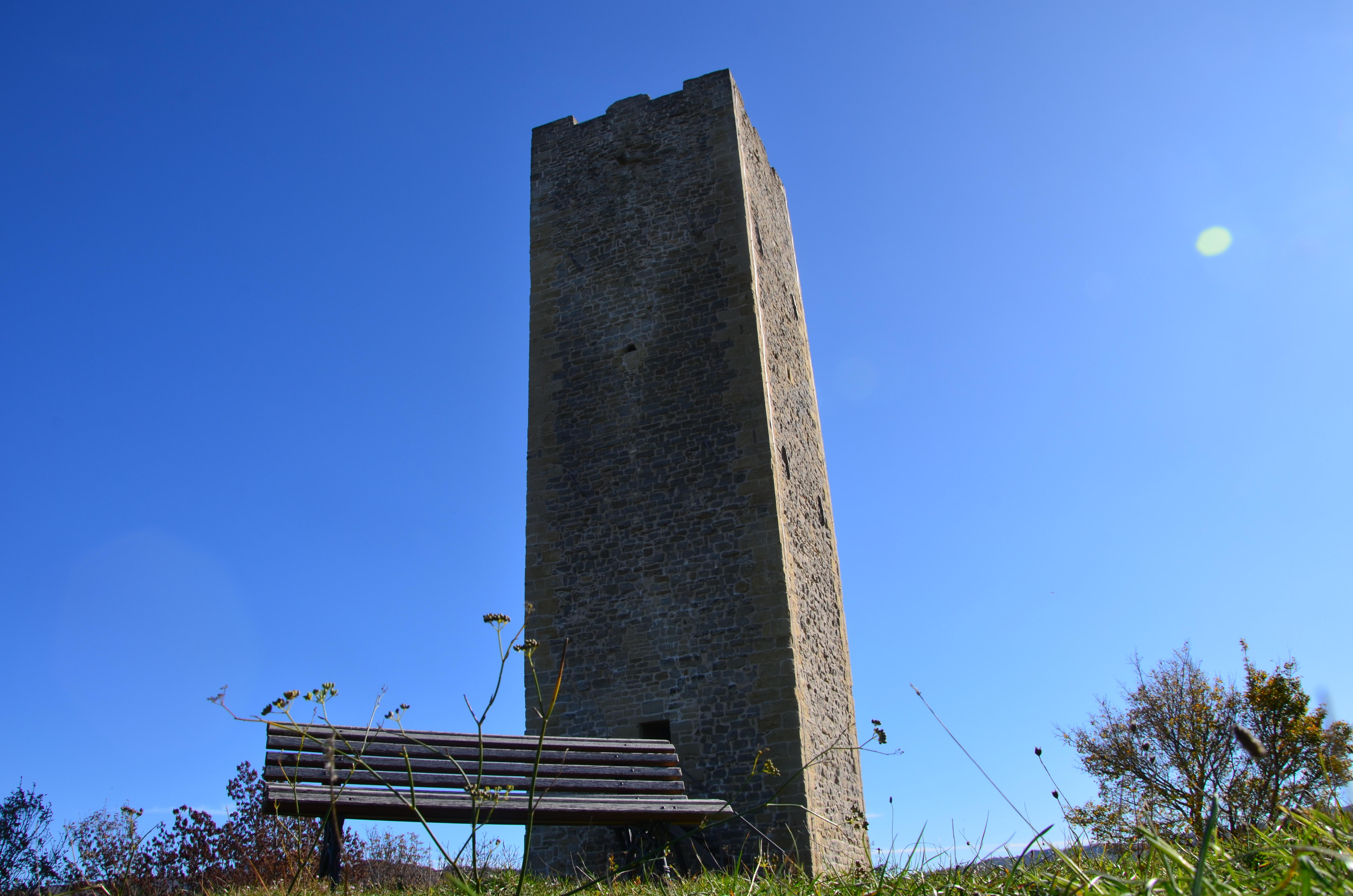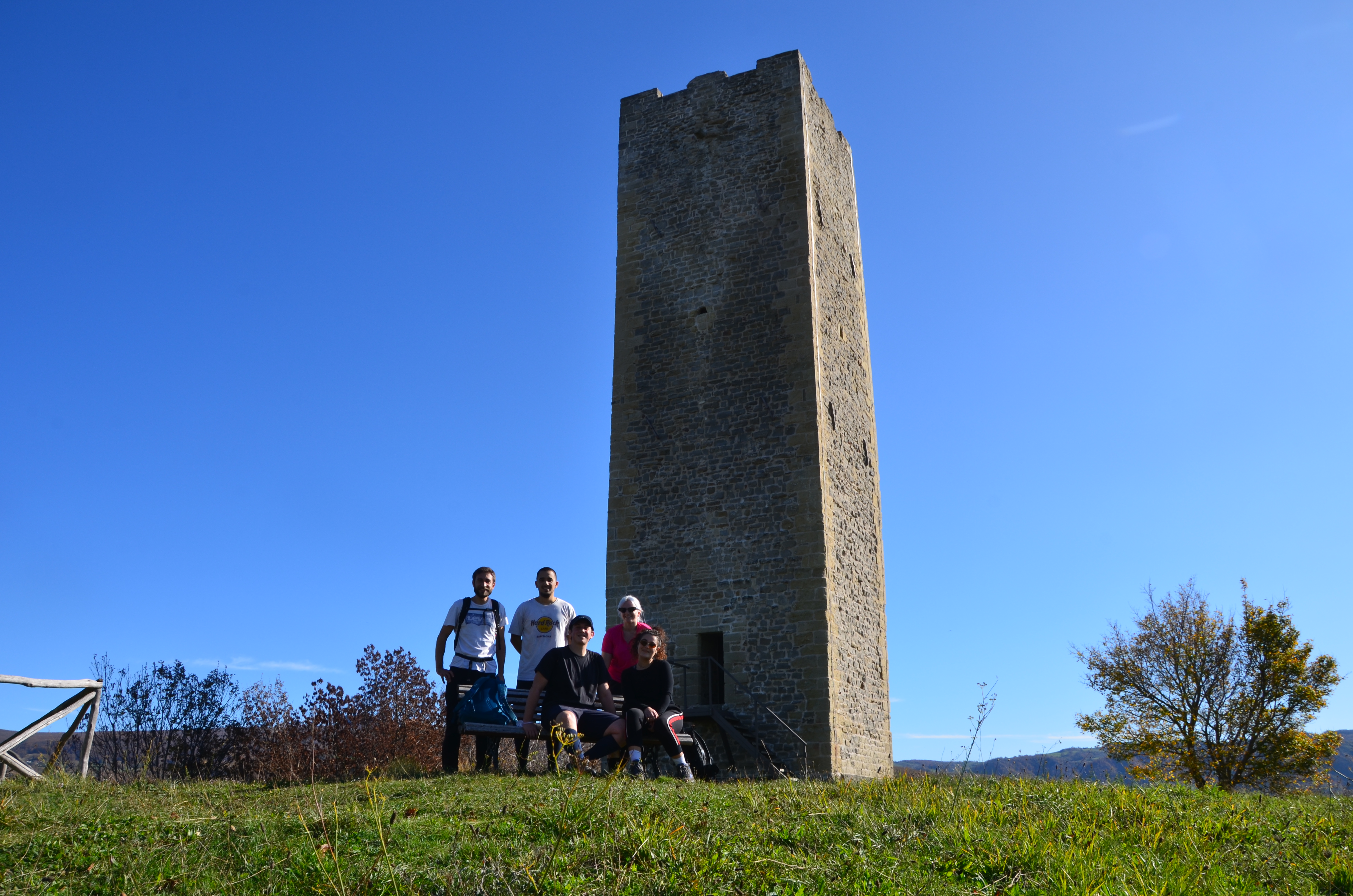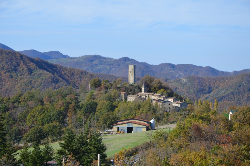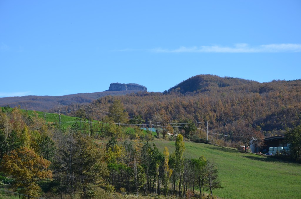 Arriviamo così a una strada asfaltata a cui teniamo la sinistra, continuando a salire. In lontananza notiamo Sasso Simone con la sua forma inconfondibile. Passo dopo passo spunta all’orizzonte anche una torre. Avvicinandoci capiamo che non è così bassa come sembrava. Castello di Bascio ormai è vicino.