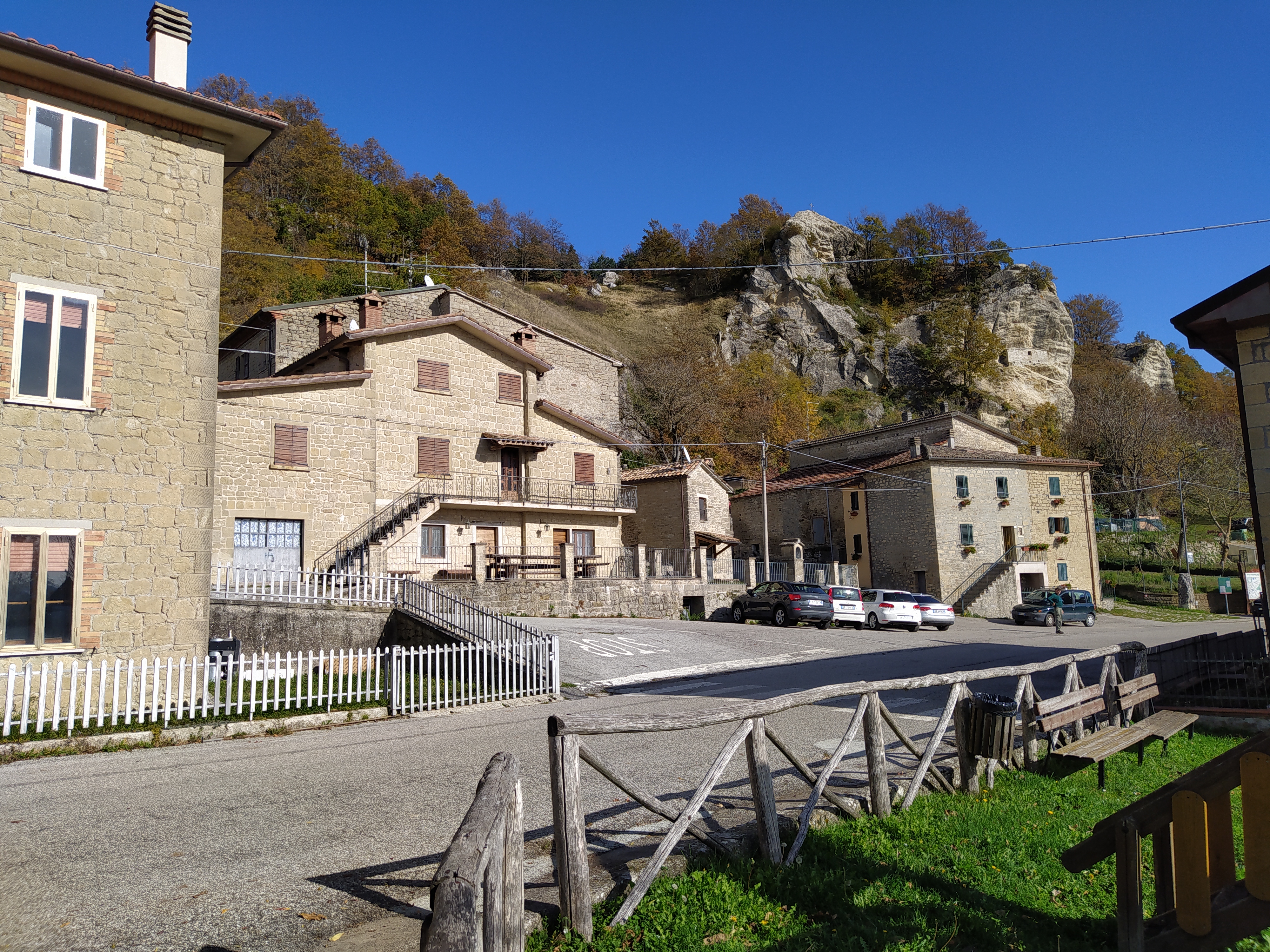 Parcheggiamo a Molino di Bascio, comune di Pennabilli. A differenza della vicina Gattara è abitata e conta anche qualche esercizio commerciale. C’è una fontanella.