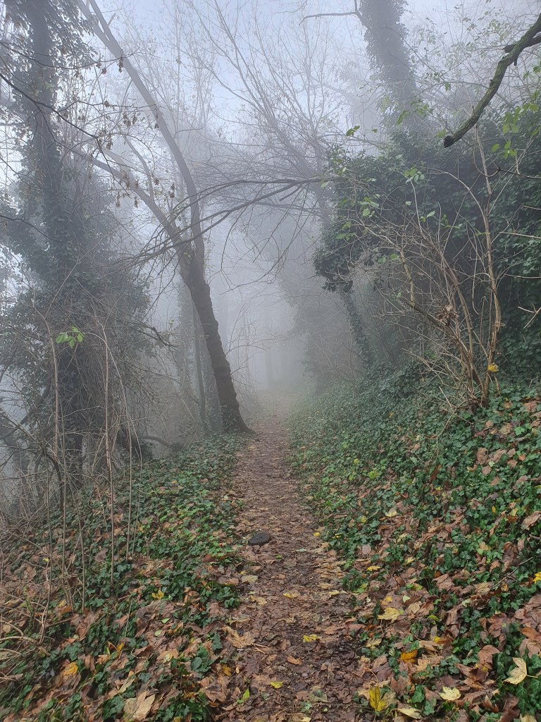 I primi chilometri scorrono molto tranquillamente, tra leggeri saliscendi e punti panoramici che dovrebbero offrire una bella veduta della vallata fino al mare. Devo ancora usare il condizionale perché abbiamo preso una giornata bella nebbiosa; poco male però, vorrà dire che ci godremo il paesaggio in versione “spettrale”.