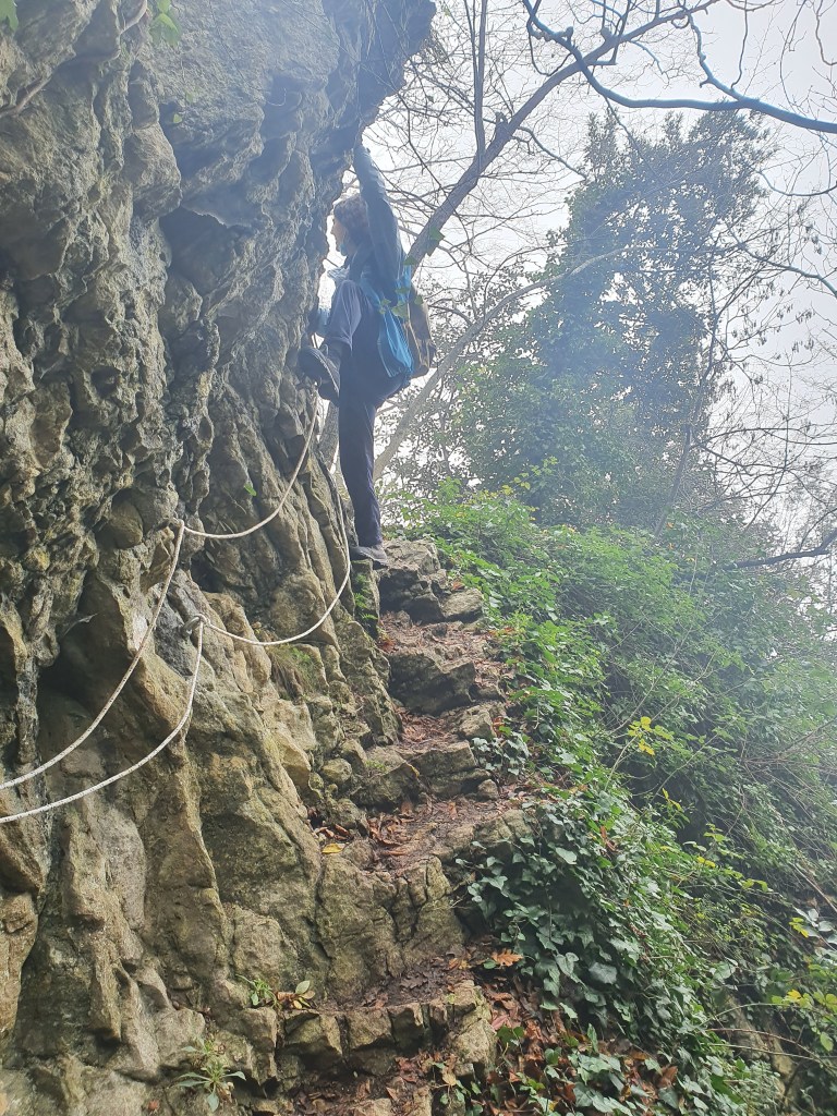 Finite le scale ci si può illudere che il pezzo difficile sia terminato, beh non proprio. Inizia infatti una discesina abbastanza scoscesa (anche in questo caso con corda di appoggio inclusa) che continuerà a mettere alla prova le vertigini di Andrea. In realtà si tratta di un pezzo breve (non banale ma breve) per poi risalire verso il Santuario della Tanaccia.