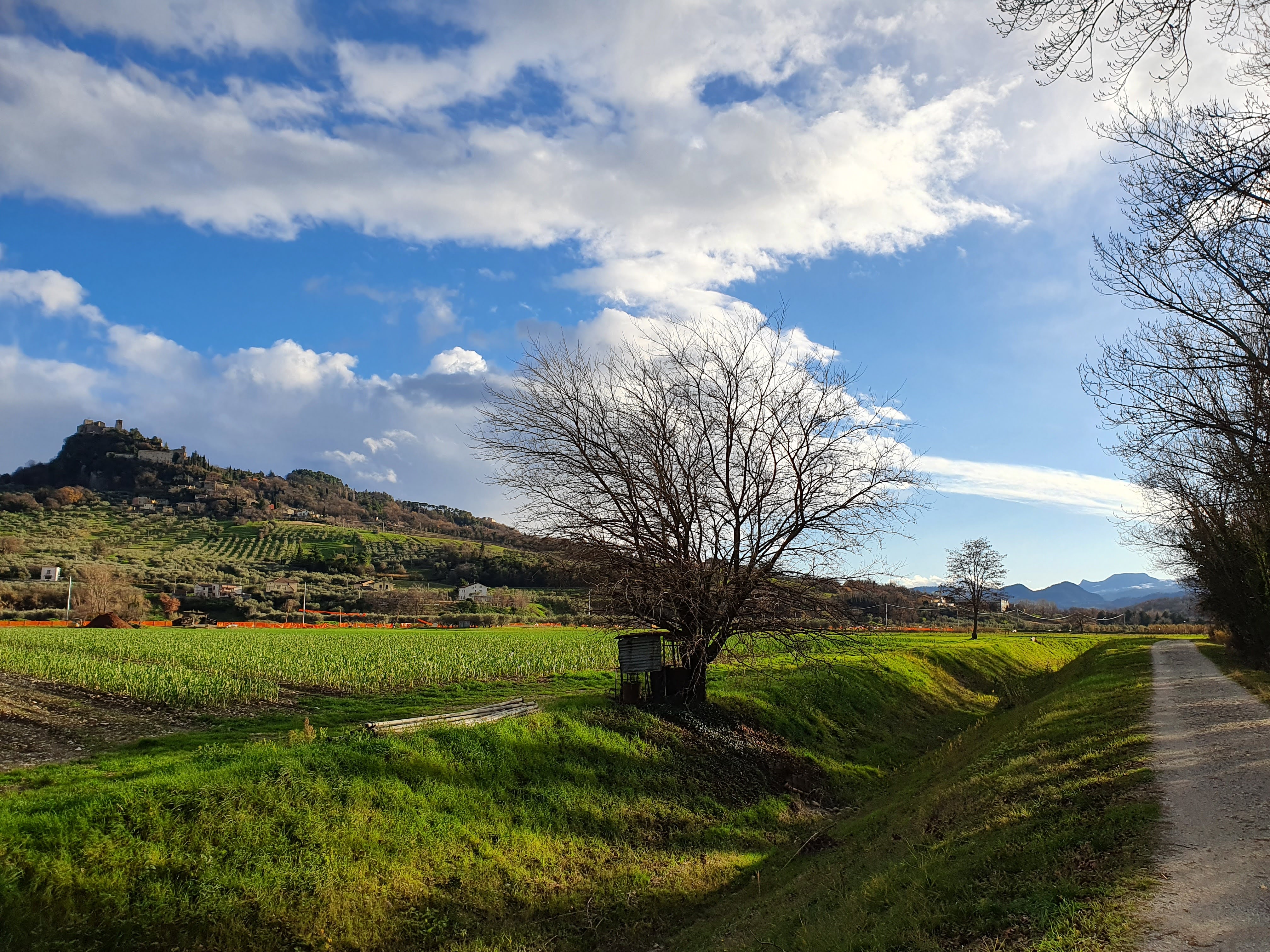 Sorpassato il campo da baseball ci si ritrova sulla ciclabile che costeggia il Marecchia. Teniamo la sinistra e camminiamo verso l’entroterra. Verucchio e Torriana (e più lontano San Marino) si vedono bene.