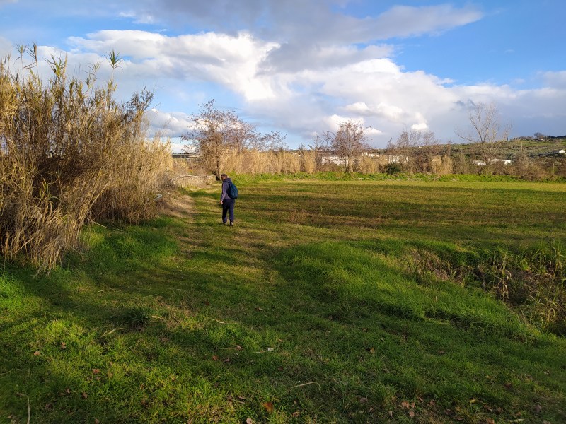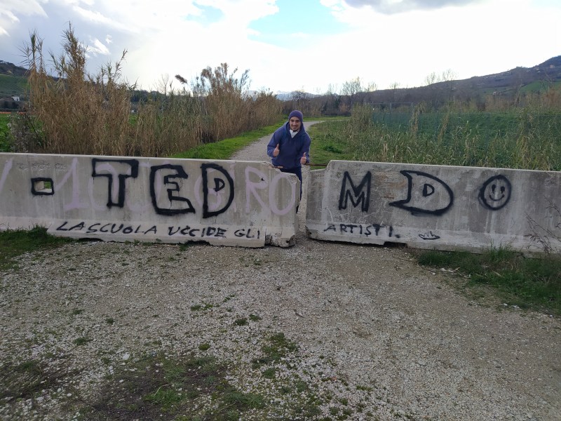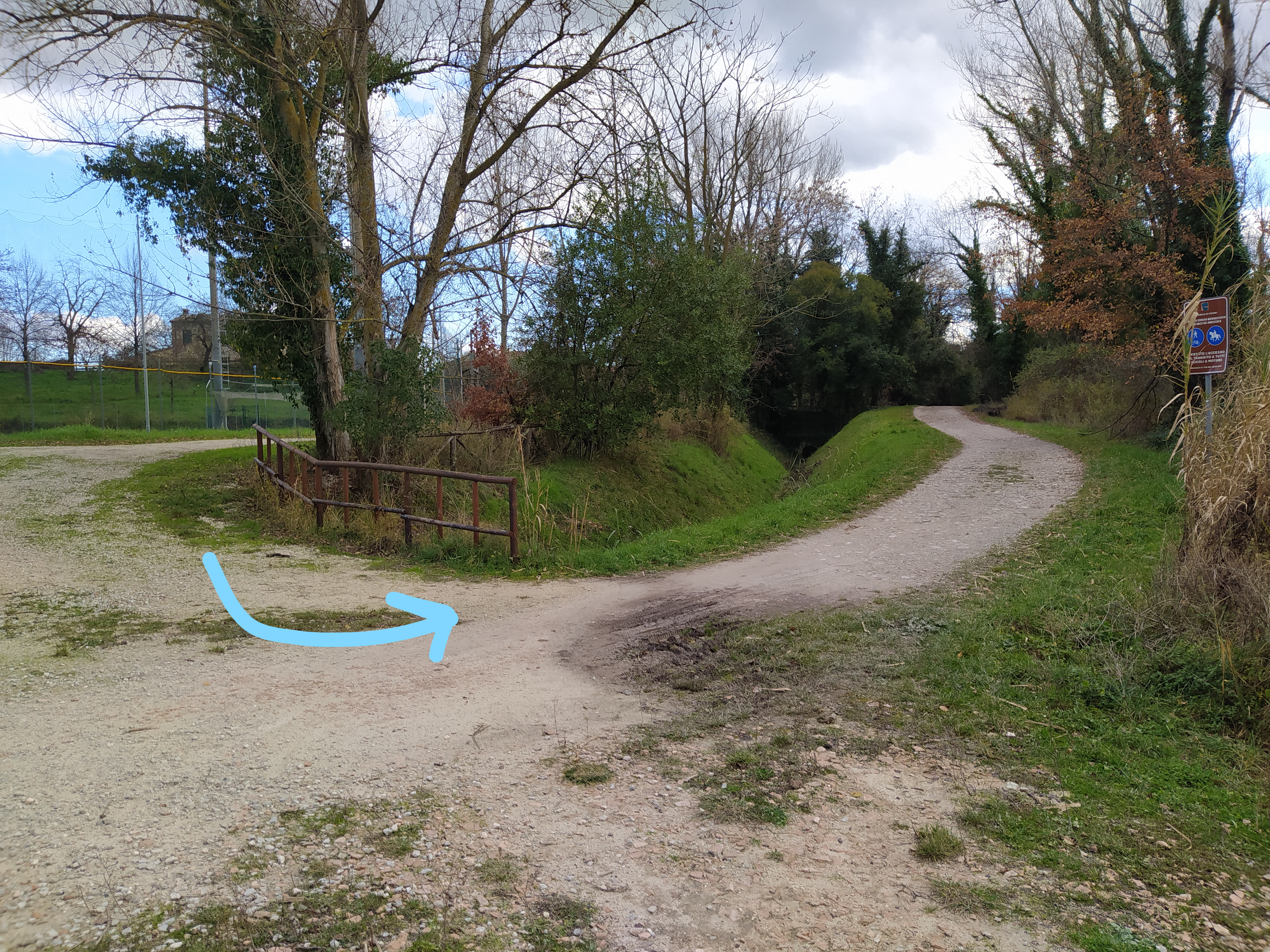 Camminiamo per un quarto d’ora sulla ciclabile. Passiamo sopra a un ponticello, facciamo lo slalom fra i new jersey (con tanto di critica sociale) e finalmente prendiamo un sentiero poco visibile in mezzo ai campi, come piace a noi.