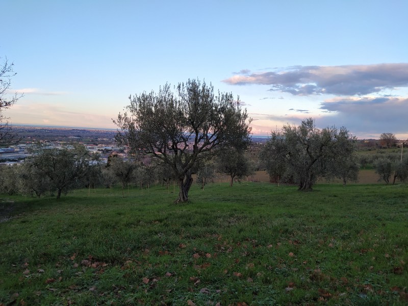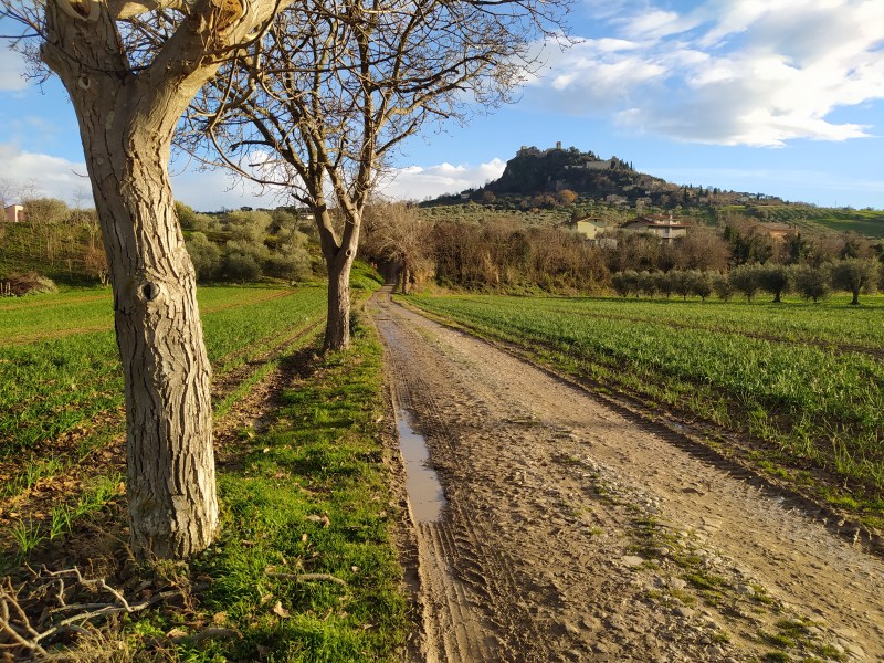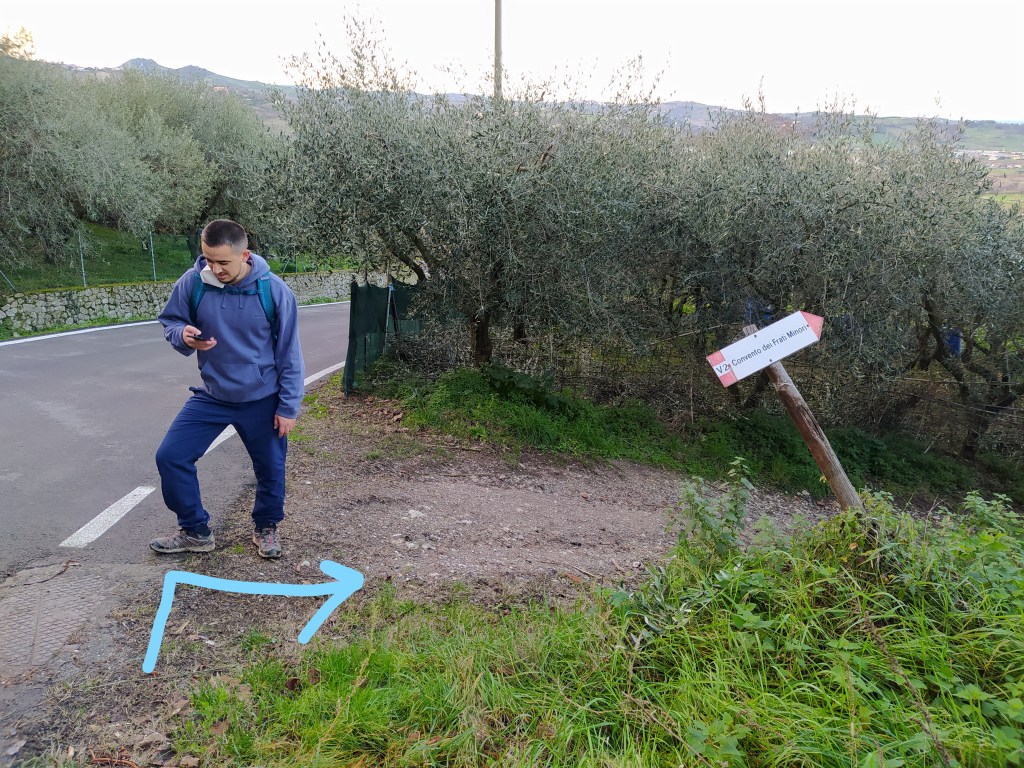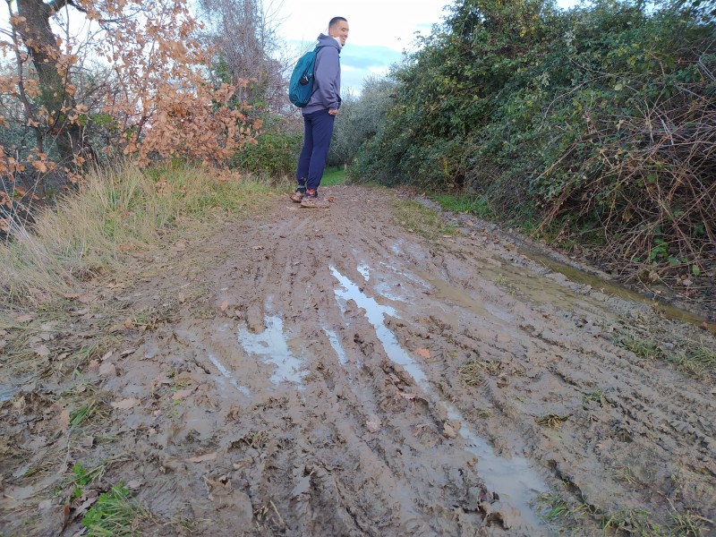 La strada è melmosa a causa della pioggia dei giorni precedenti. Passiamo di fronte a un’azienda agricola. Questo pezzo è molto bello: si cammina fra gli ulivi secolari. Infine facciamo ritorno all’incrocio a quattro di cui parlavamo sopra, a cui teniamo la destra (è il Cammino di San Francesco percorso in direzione contraria).