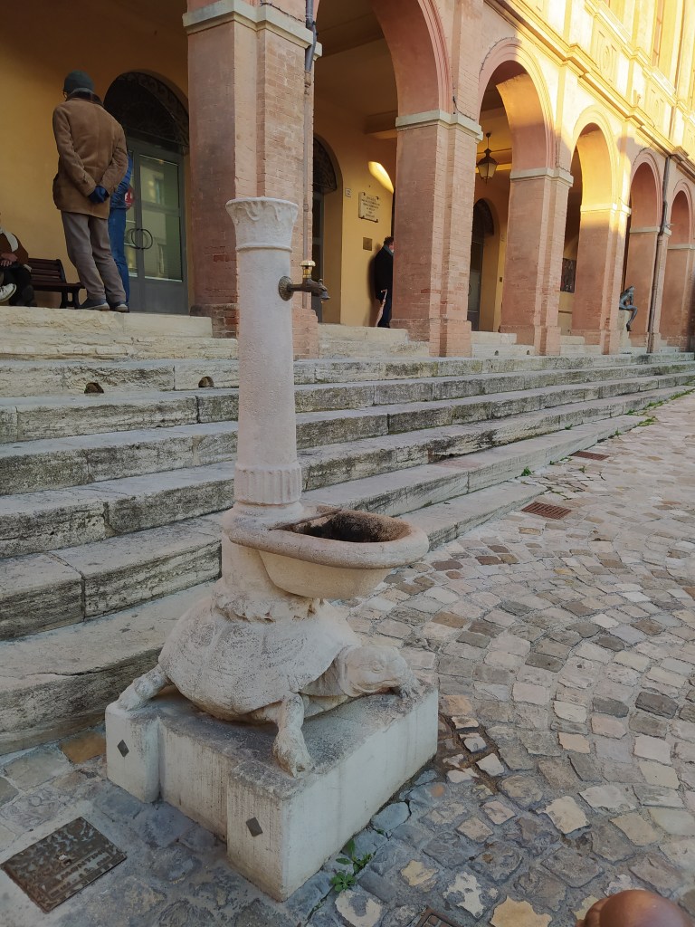 L’ultima parte di salita è fatta di infiniti gradini in un viale alberato. Sbuchiamo così di fronte al Museo archeologico di Verucchio. Siamo nel cuore della cittadina. Ci dirigiamo verso il centro seguendo il decorso della cinta muraria e passando sotto la porta di Sant’Agostino. Pochi passi ancora e vediamo la fontana della Tartaruga: siamo in Piazza Malatesta.