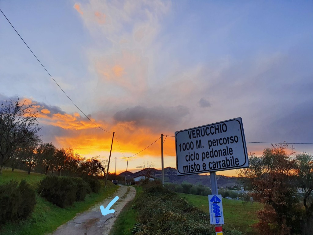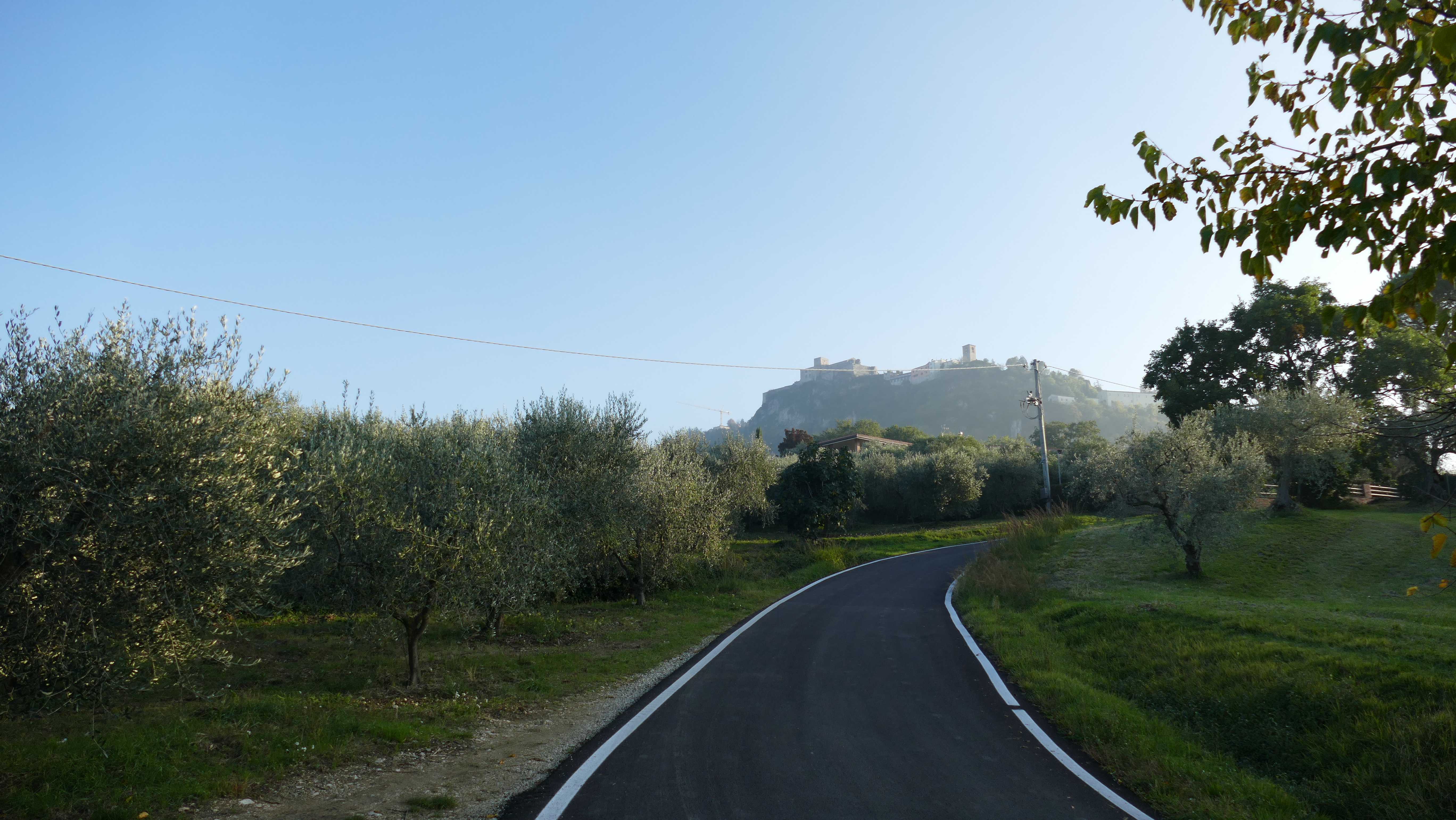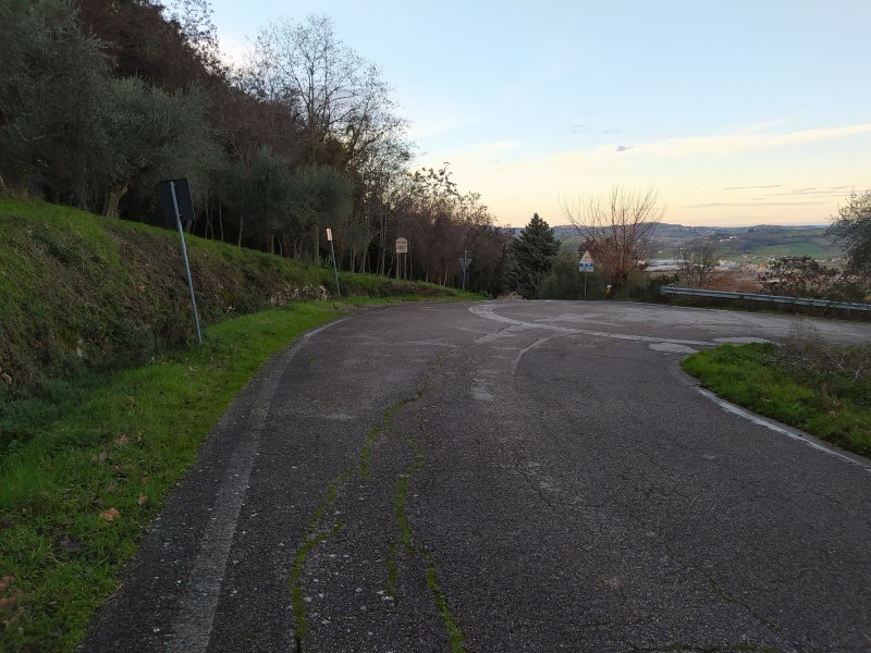 Si continua a salire, su asfalto. Arriviamo a un incrocio a quattro strade: è l’inizio dell’anello attorno a Verucchio. Noi teniamo la destra e proseguiamo sull’asfalto verso il Borgo Sant’Antonio. Quando scenderemo da Verucchio, faremo ritorno qui e terremo la destra.