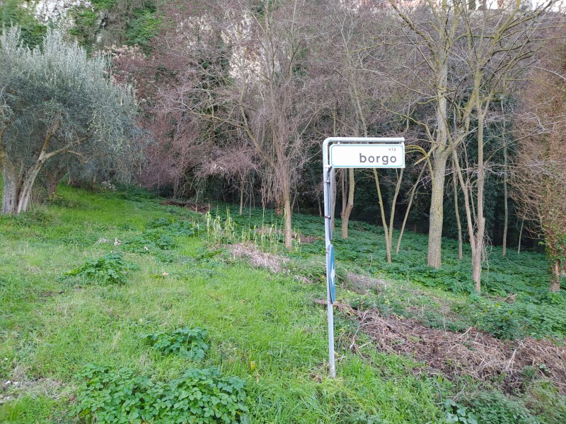 Ritorniamo su strada, precisamente sulla Strada Provinciale 15bis che porta a Verucchio. La percorriamo tenendo la sinistra e dopo pochi metri imbocchiamo Via Borgo. Ecco allora sulla sinistra comparire fra la vegetazione la segnaletica del sentiero V2.