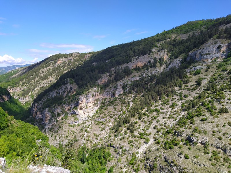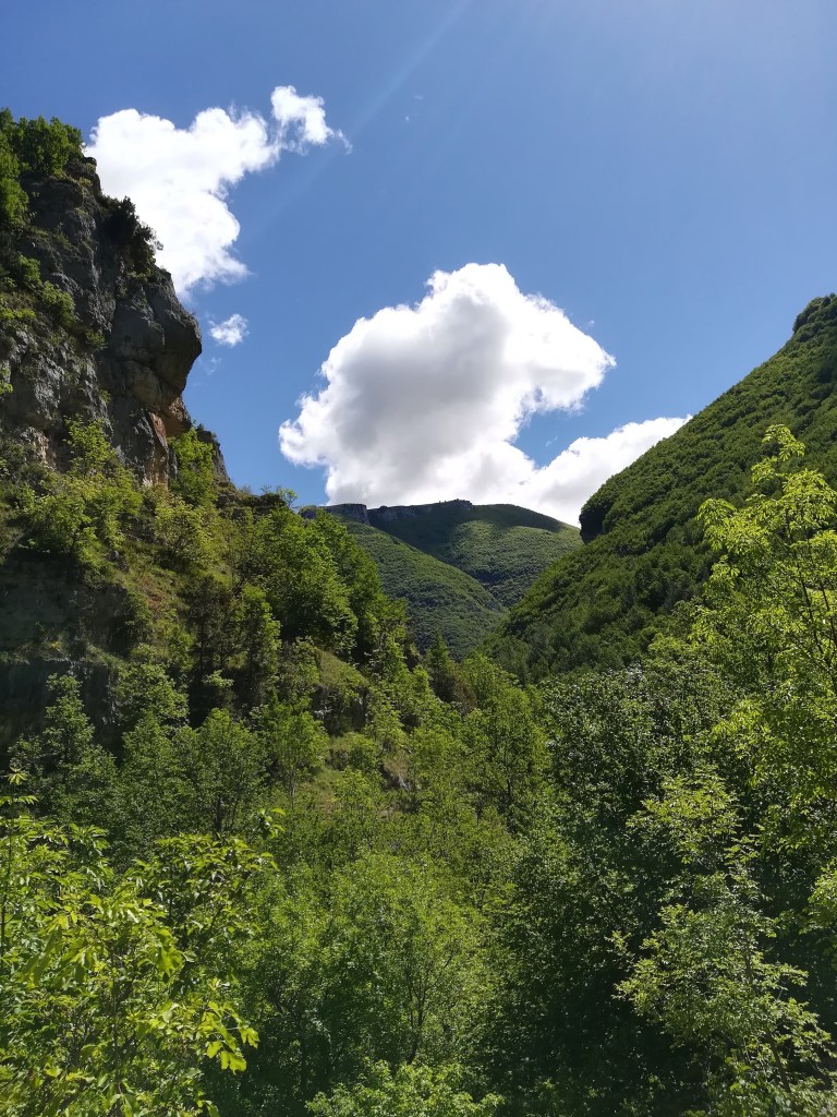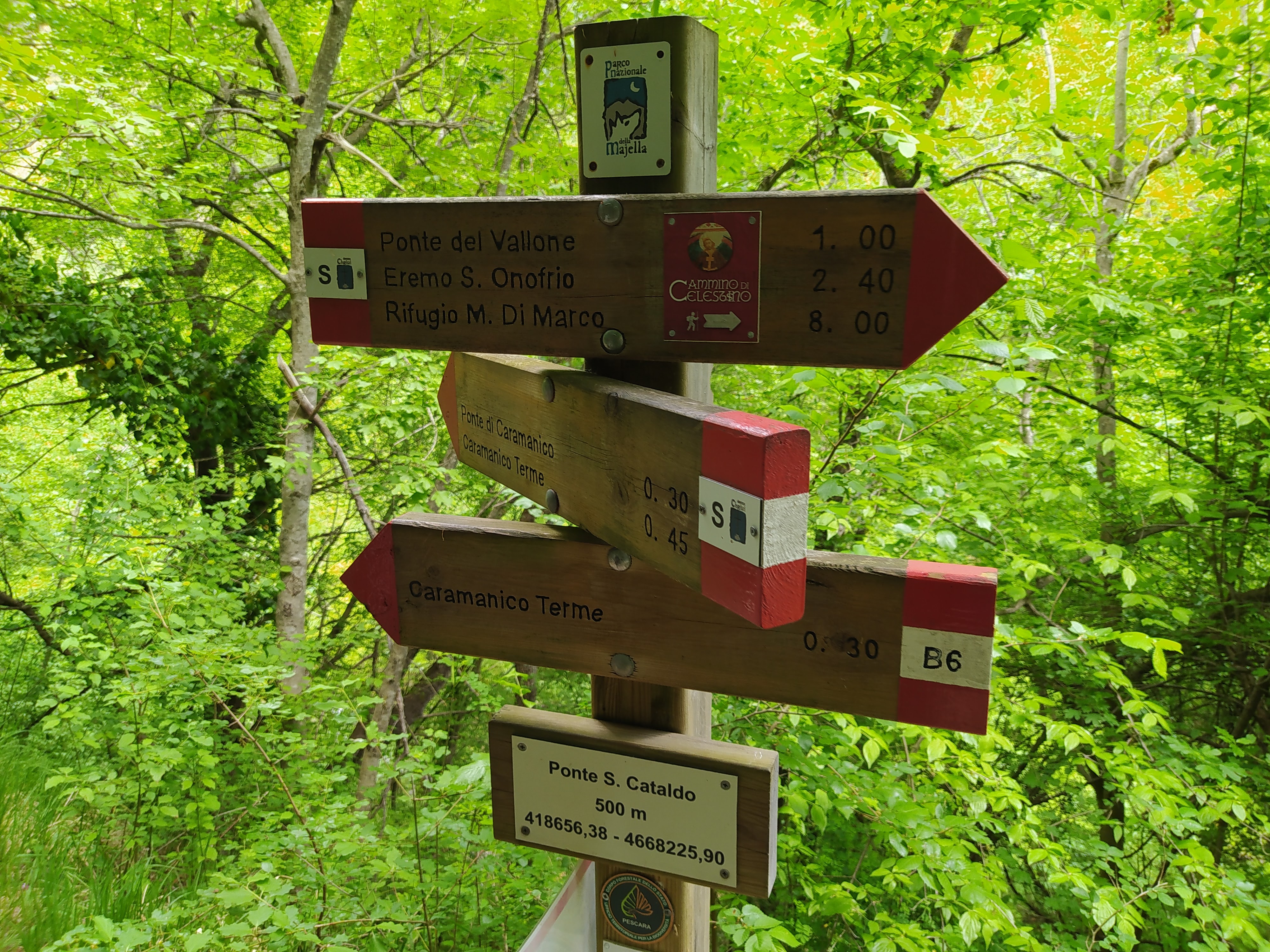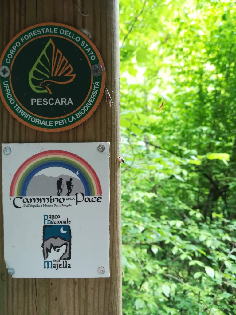 Attraversiamo il Ponte San Cataldo (senza sponde, fate attenzione), dove il sentiero S si interseca con il B6. Qui la sentieristica è molto fitta: notiamo i loghi del Cammino della Pace e del cammino di Celestino, a prova di quanto il parco della Majella abbia investito sul turismo lento. Noi continuiamo sull’ S per il Ponte di Caramanico, perdendo quota.