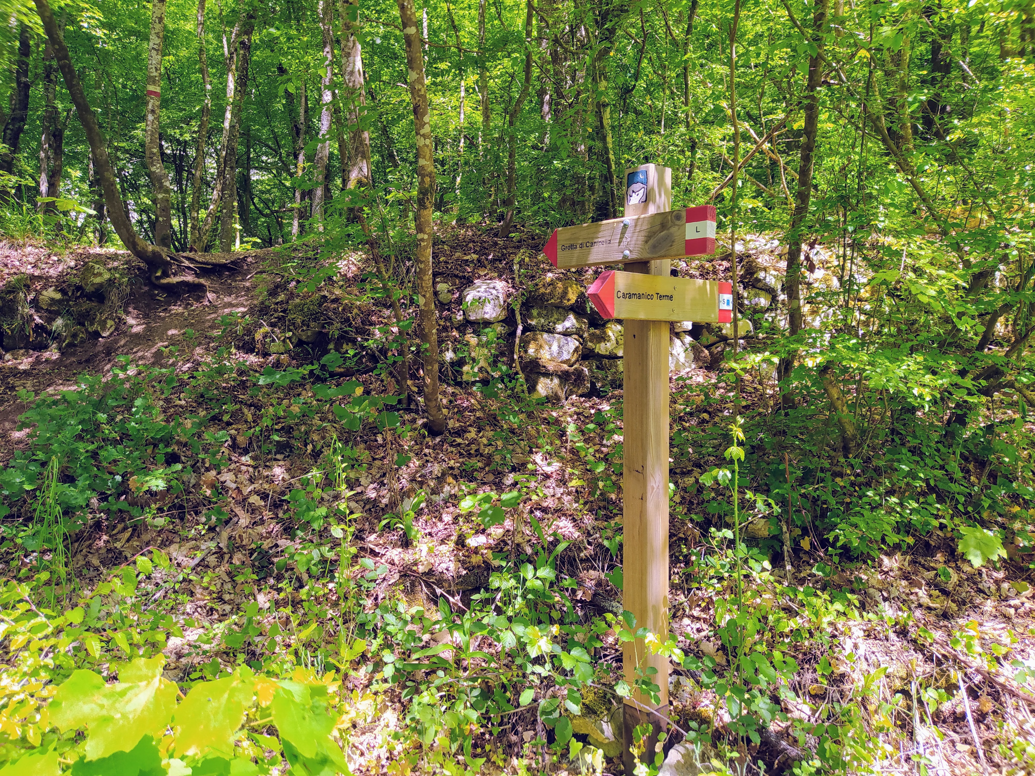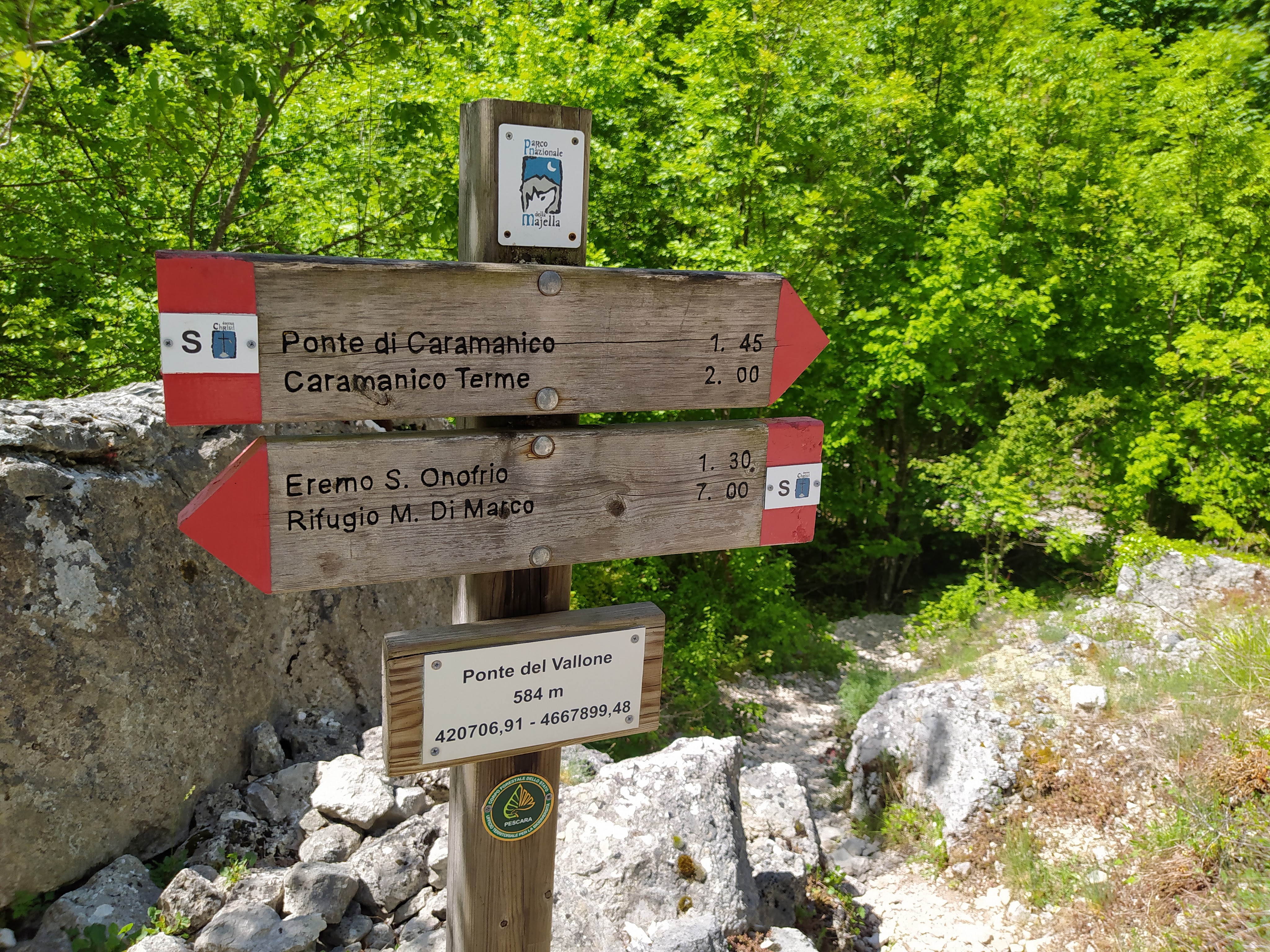 Attraversiamo il Ponte del Vallone portandoci sull’altra sponda. Prendiamo così il sentiero S in direzione di Caramanico Terme.