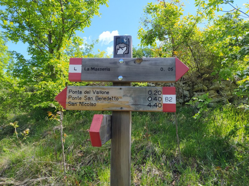 Il sentiero prosegue piacevolmente fra la fitta vegetazione del bosco, concedendo in un secondo momento scorci panoramici sulla valle. Segnaliamo la possibilità di effettuare una piccola deviazione per “La Masseria”(5mn dal B2)