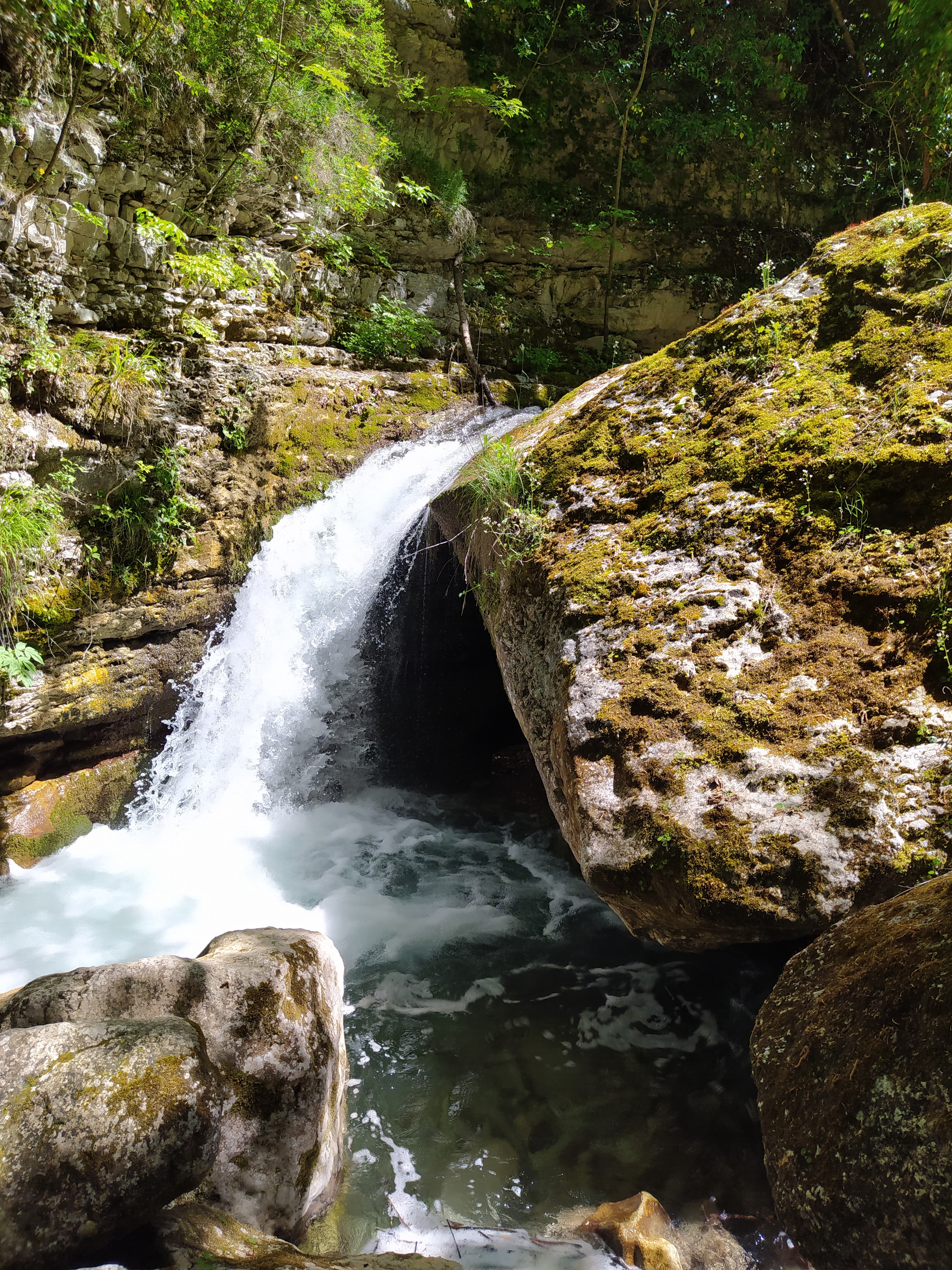 Il fragore dell’acqua si fa più forte, passo a passo. Infine lo vediamo: l’Orfento scorre di fronte a noi, in tutta la sua potenza. Immergiamo i piedi. L’acqua è gelida oltre ogni immaginazione. Maggio è decisamente troppo presto per godere di questo angolo di paradiso.