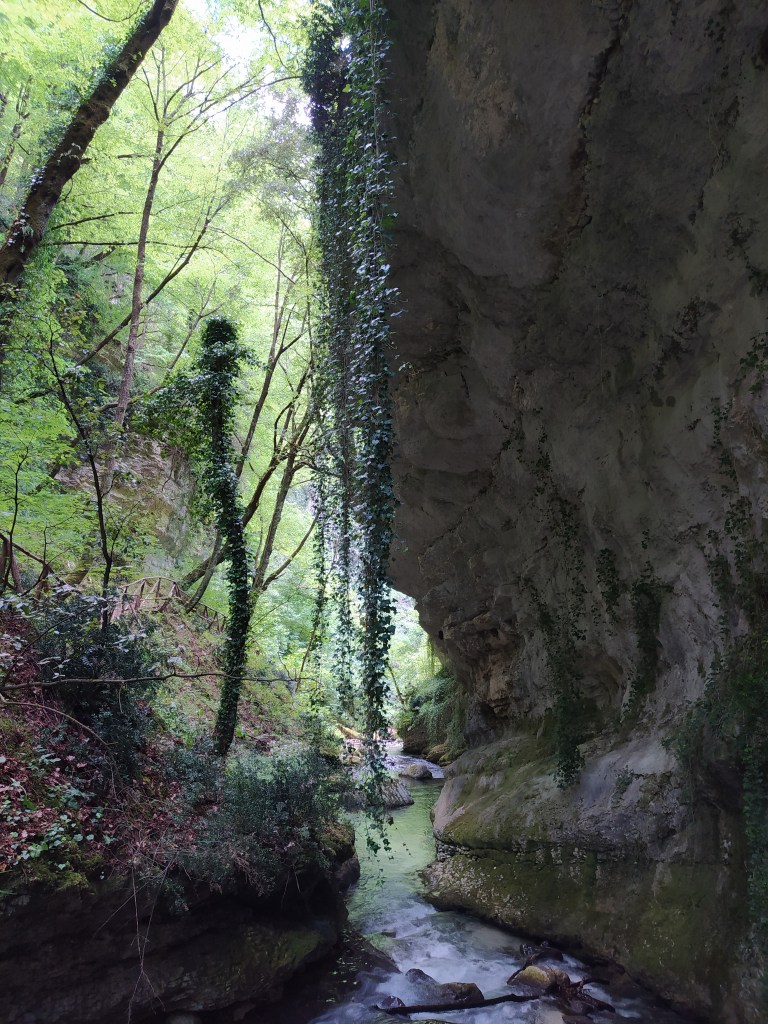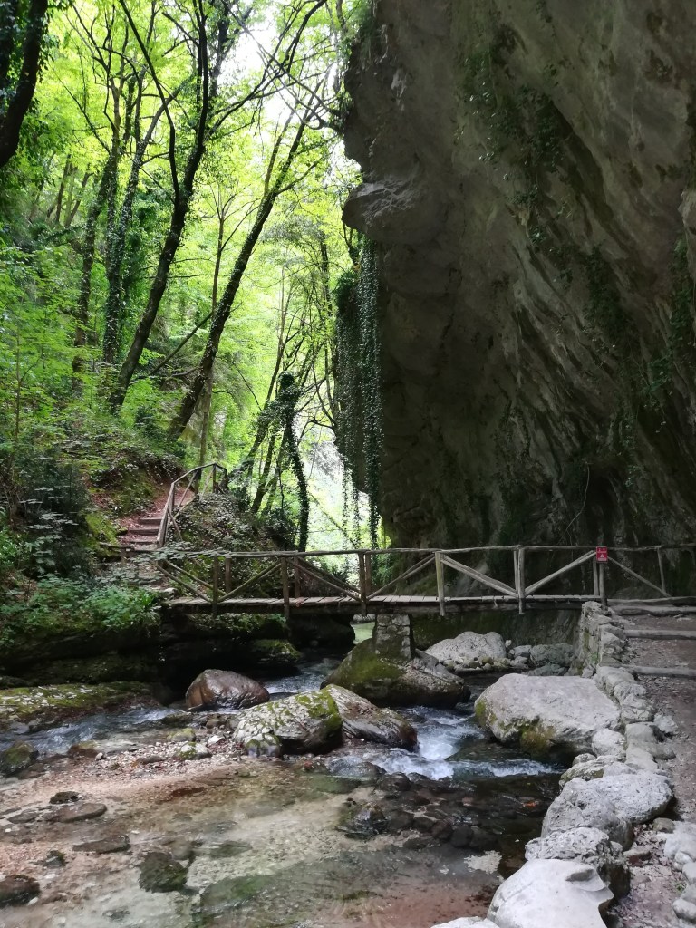 Riportiamo le foto a grandezza aumentata per apprezzare meglio questo tratto di trekking. Si passa più volte da una sponda all’altra del fiume attraverso dei ponticelli in legno. Infine si salgono dei gradoni che portano al Ponte di Caramanico.