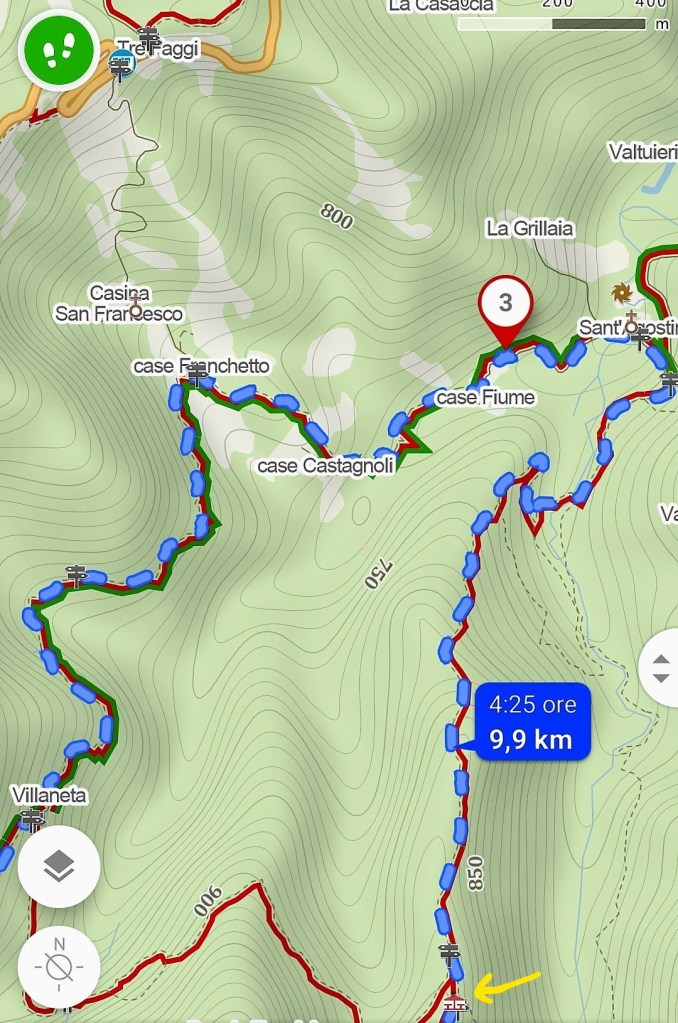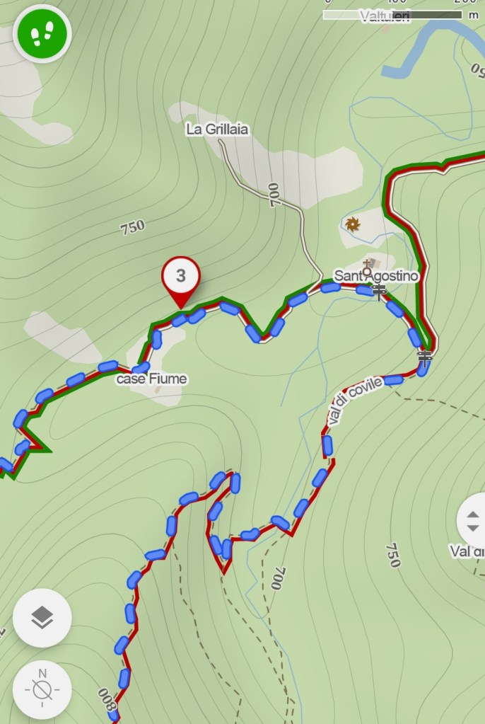 Attraversato il ponte, tenendo la sinistra si ricomincia a salire. Dopo circa 10 minuti di camminata si arriva ad un bivio, dove si lascia il sentiero sterrato e tenendo sempre la sinistra si prende una strada in ghiaia imboccando così il sentiero 249. Pochi passi e si arriva alla Chiesa di Sant’Agostino.