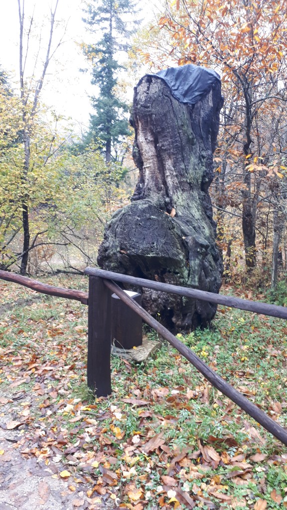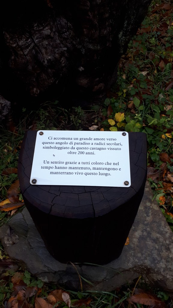 Poco prima della chiesa, possiamo notare sulla destra il tronco di un castagno secolare vissuto per oltre 200 anni; su questo è posta una targa che ci invita a prenderci cura e a mantenere vivi questi luoghi.