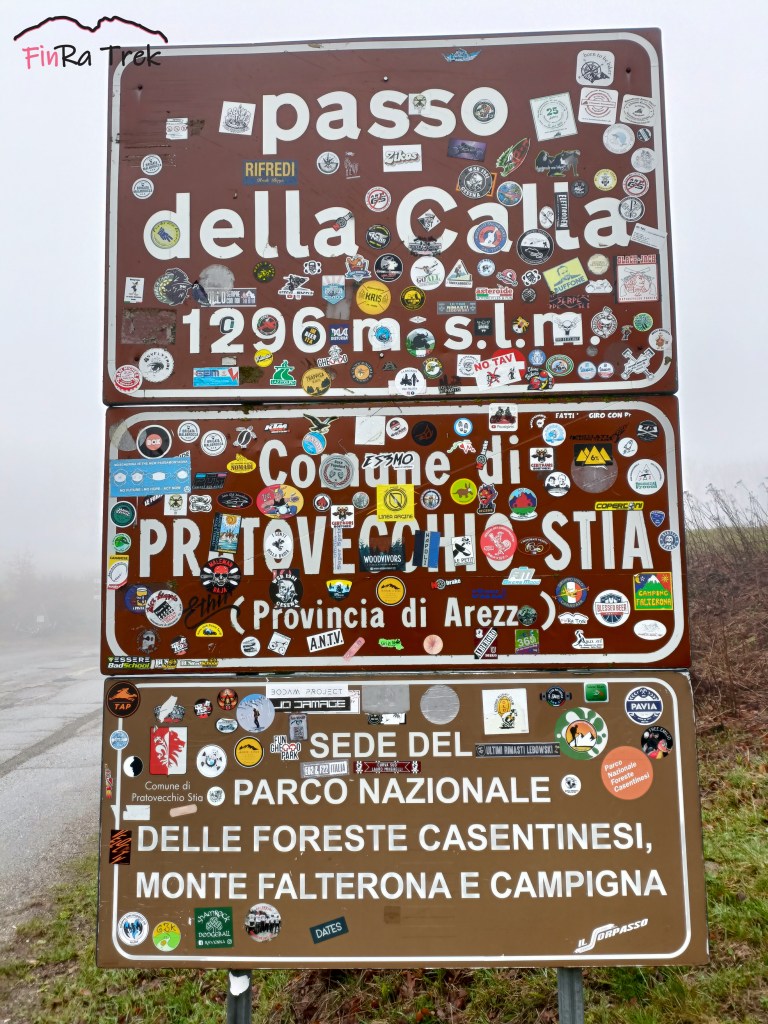 Arriviamo così al famigerato Passo della Calla, purtroppo senza godercelo a pieno. Infatti la nebbia non lascia intravedere alcun panorama e il forte vento, che sarà un compagno di cammino, non ci permette di sostare a dovere. Segnaliamo nelle vicinanze il Ristorante I Faggi e il Rifugio CAI La Calla.