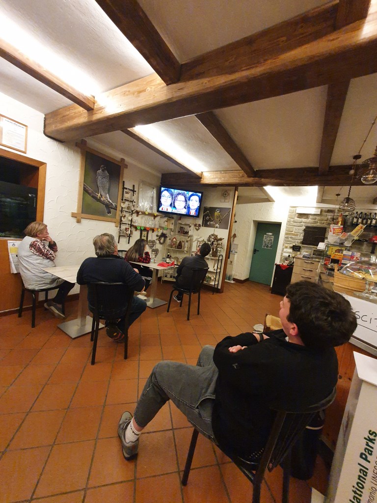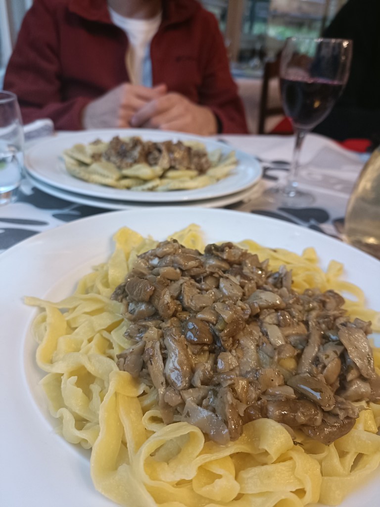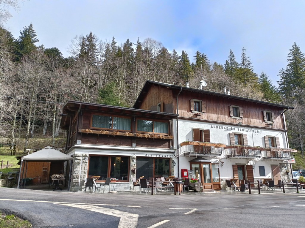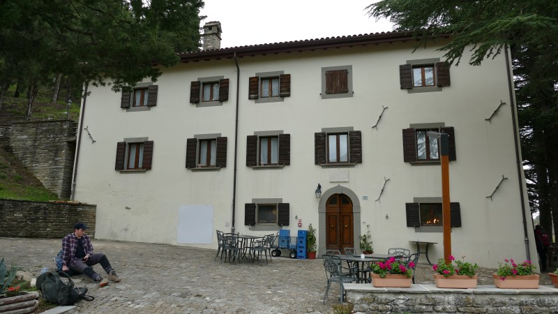 Alloggiamo all’Albergo Lo Scoiattolo, gestito da Maura e Giorgio. Campigna è minuscola, composta da qualche struttura ricettiva e niente di più: Maura ci dice che a sua memoria, Campigna conterà quattro abitanti compresi lei e il marito. Lo Scoiattolo è ben tenuto e accogliente. Il cibo è quello tipico del luogo: tagliatelle ai porcini, cinghiale in salmì e tanto vino della casa. Complice il maltempo, non ci sono altri turisti in albergo. Trascorriamo quindi la serata a vedere I Soliti Ignoti alla Tv con Giorgio e Maura, in un clima di familiare accoglienza, di cui possiamo essere semplicemente grati.