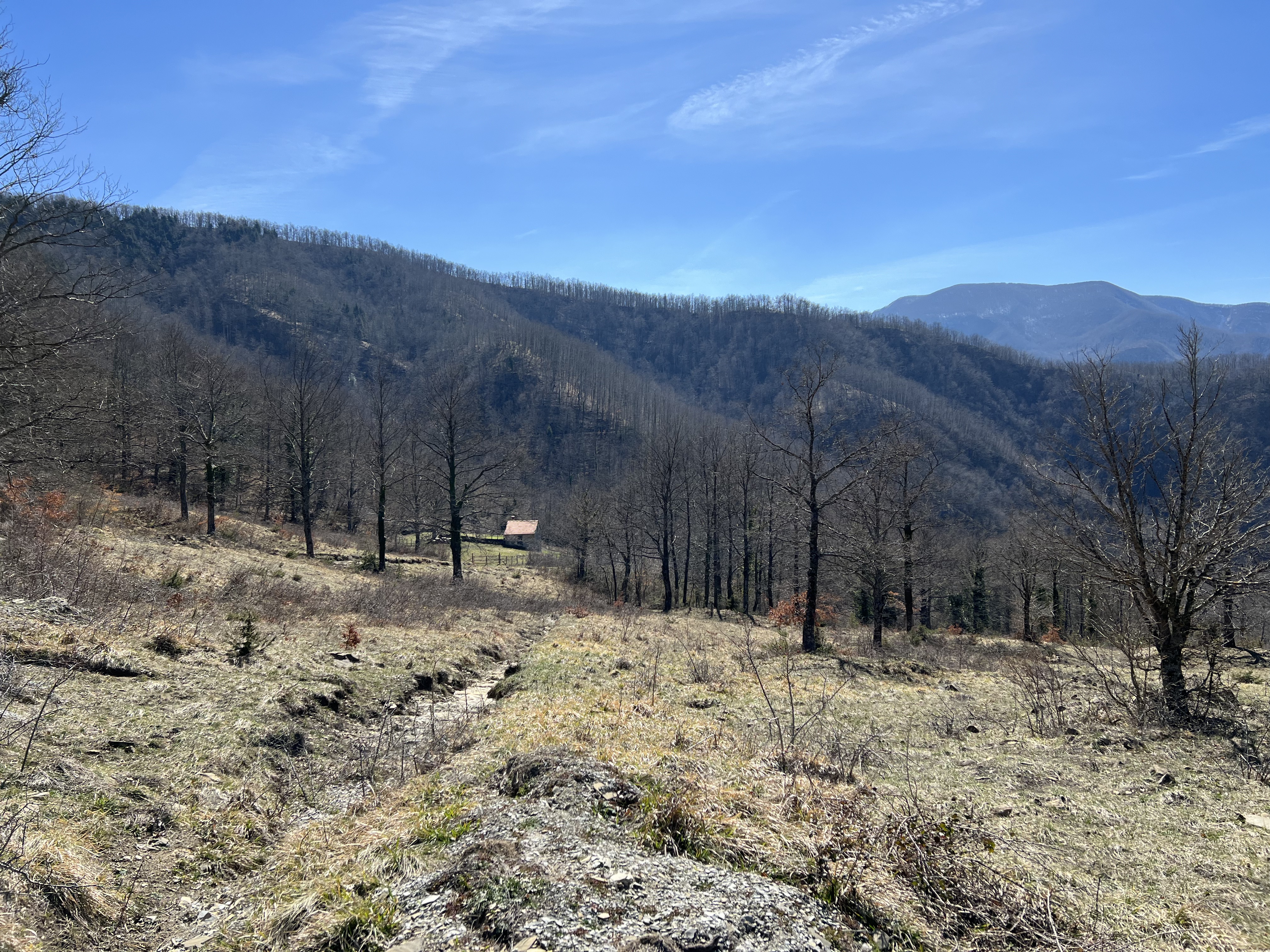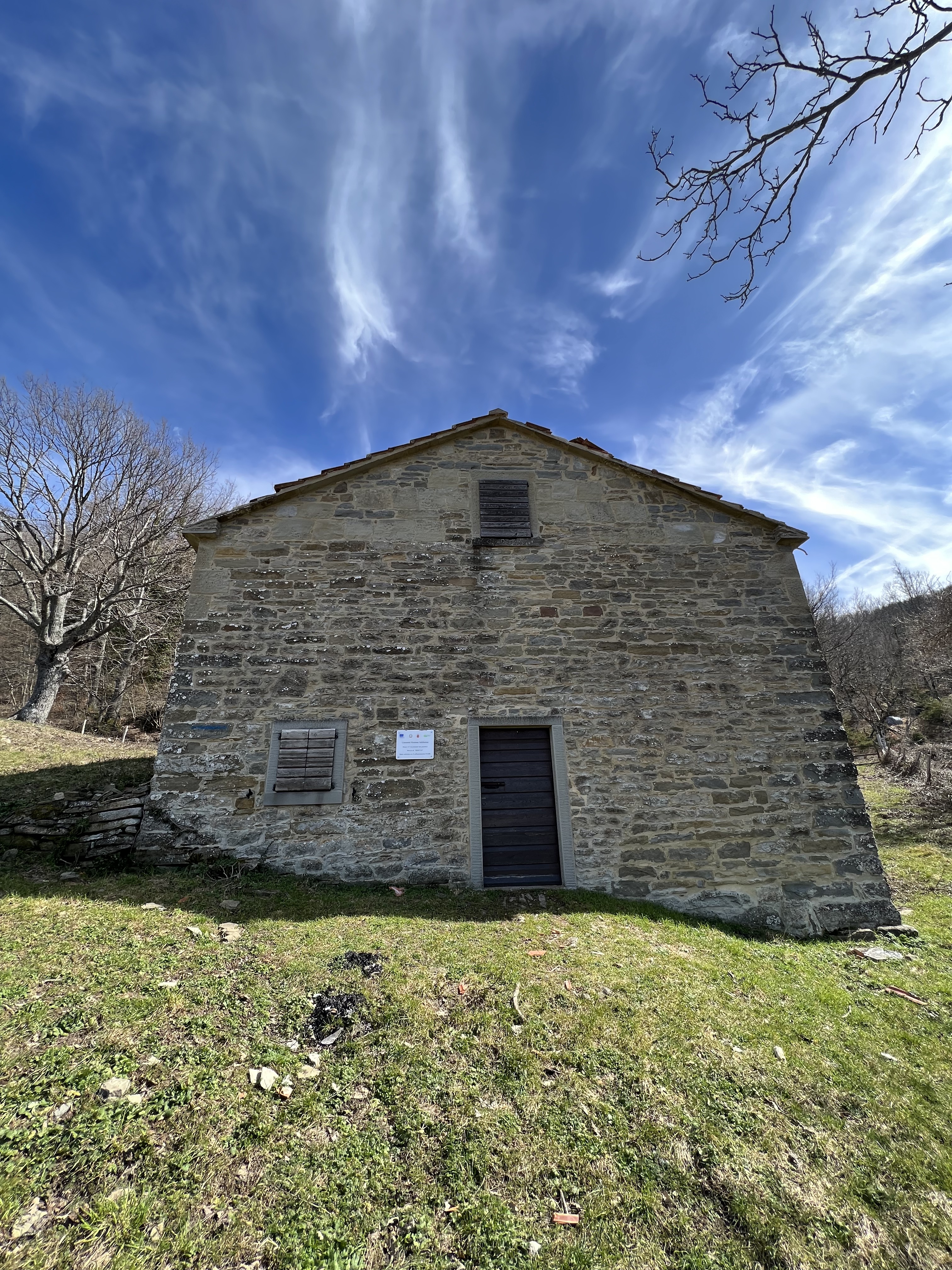 Questo splendido bivacco offre tutto ciò che può servire al viaggiatore: un riparo, un camino e dei tavoli. Una targa comunica al viandante che il bivacco è stato realizzato intercettando i fondi europei. Evidentemente la regione Toscana ha saputo fare la sua parte… Che prima o poi faccia qualcosa di simile anche il versante romagnolo? Vena polemica a parte questo posto è una gioia per gli occhi e per lo spirito, perfetto per una pausa pranzo e verosimilmente anche per un pernotto. Ci torneremo sicuramente.
