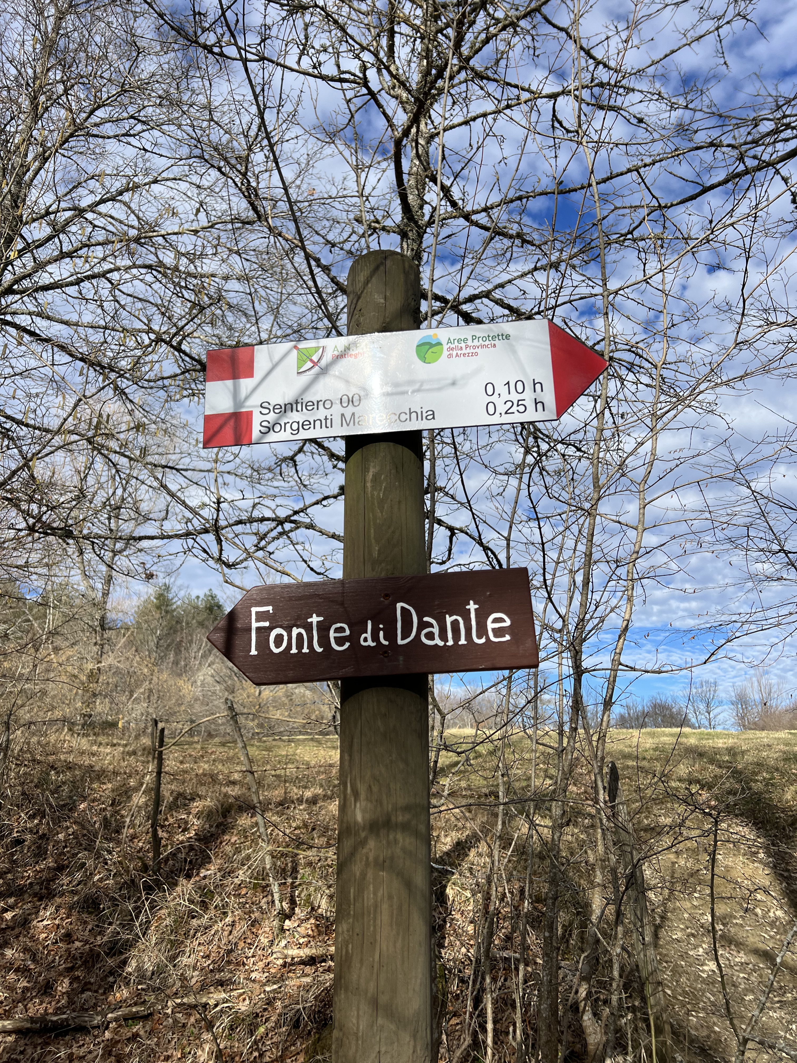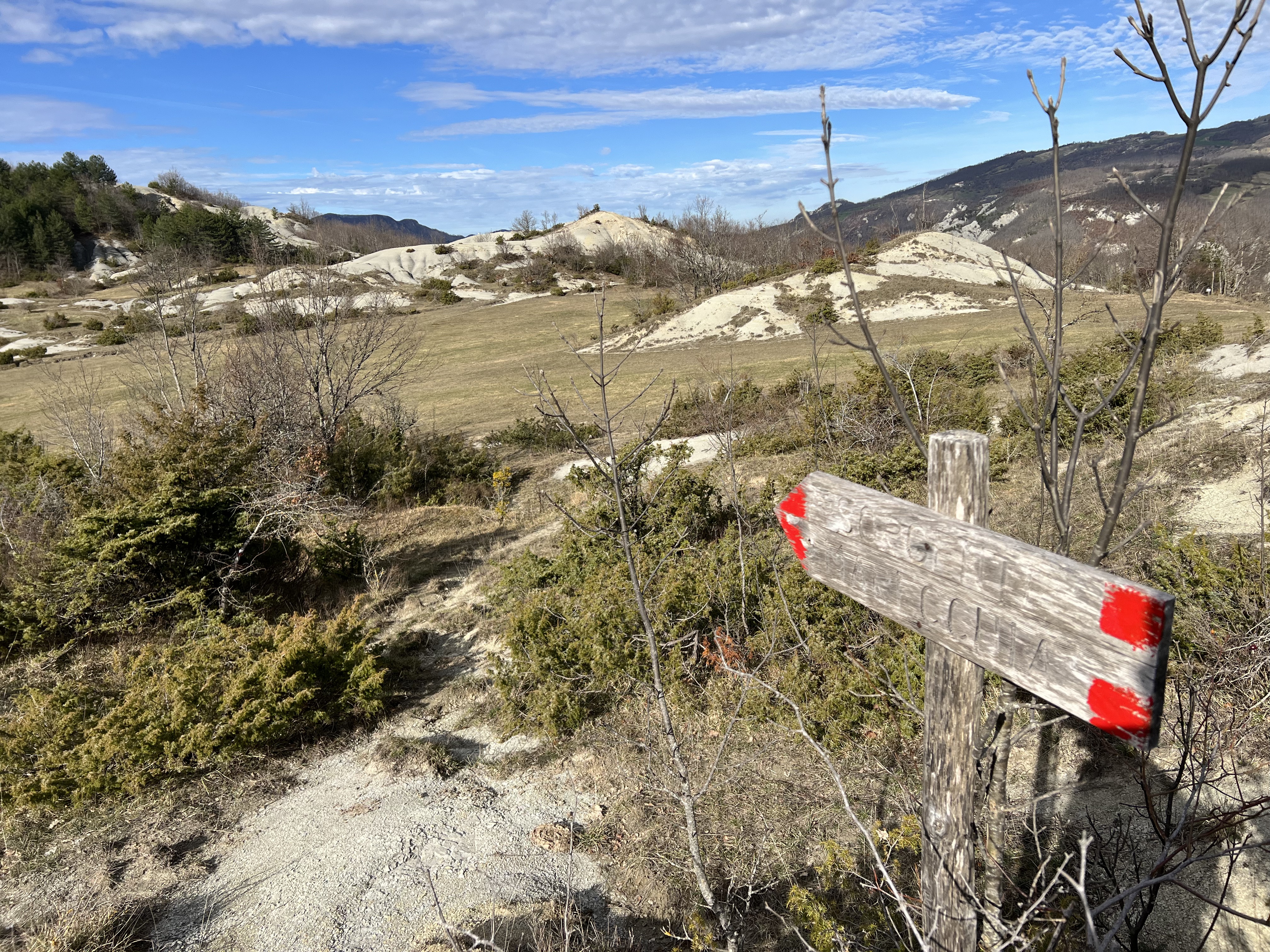 La prima, importante, meta di giornata si intuisce già dalla segnaletica, ovvero le sorgenti del fiume Marecchia. In pochi minuti si supera la deviazione per la Fonte di Dante (niente di ché in realtà) e ci si ritrova in un paesaggio quasi lunare, caratterizzato da roccia argillosa e piccoli calanchi. Prestare attenzione perché a un certo punto, sulla destra, un cartello mal ridotto indica la deviazione per abbandonare il sentiero 00 e raggiungere le sorgenti.