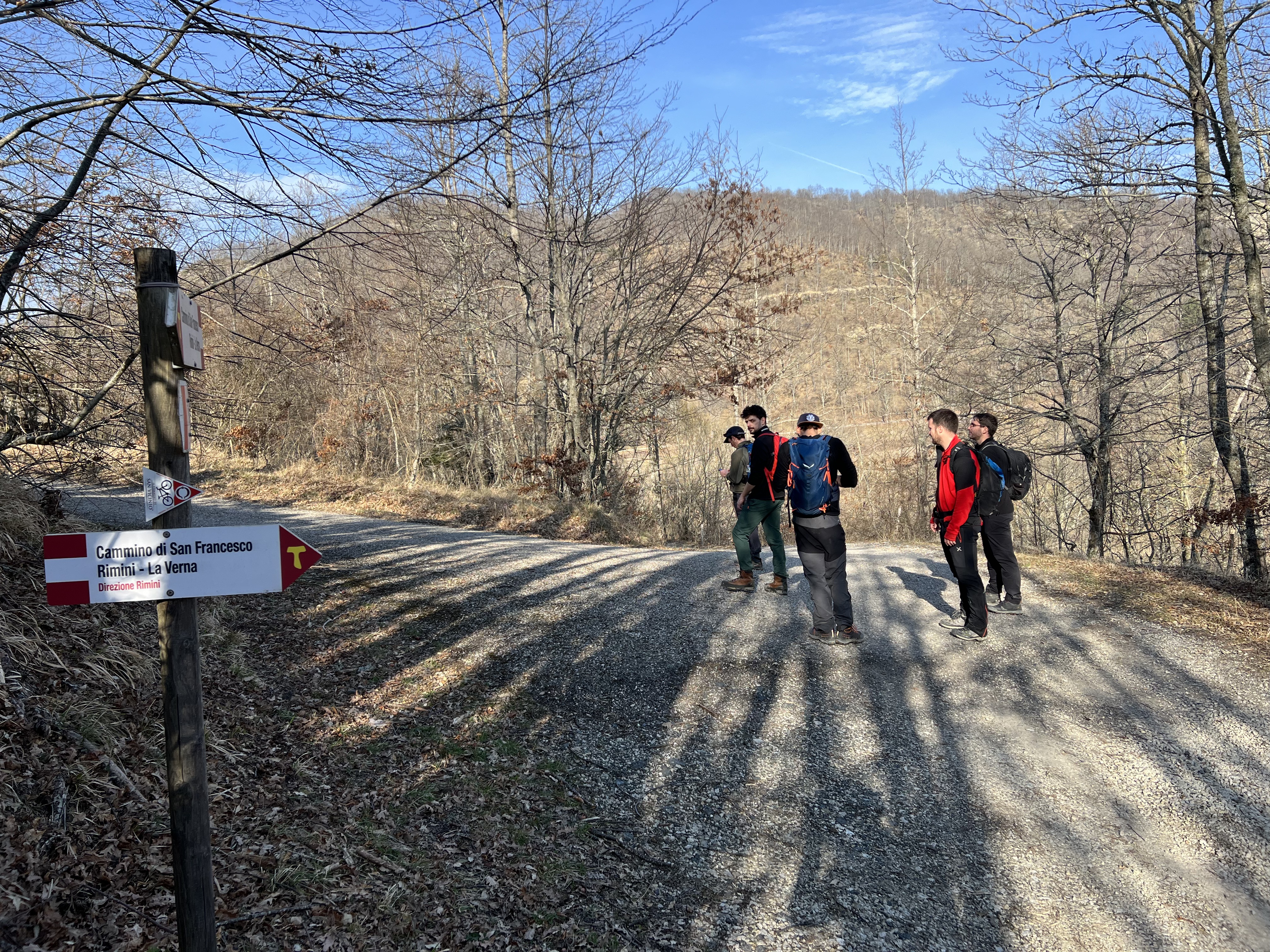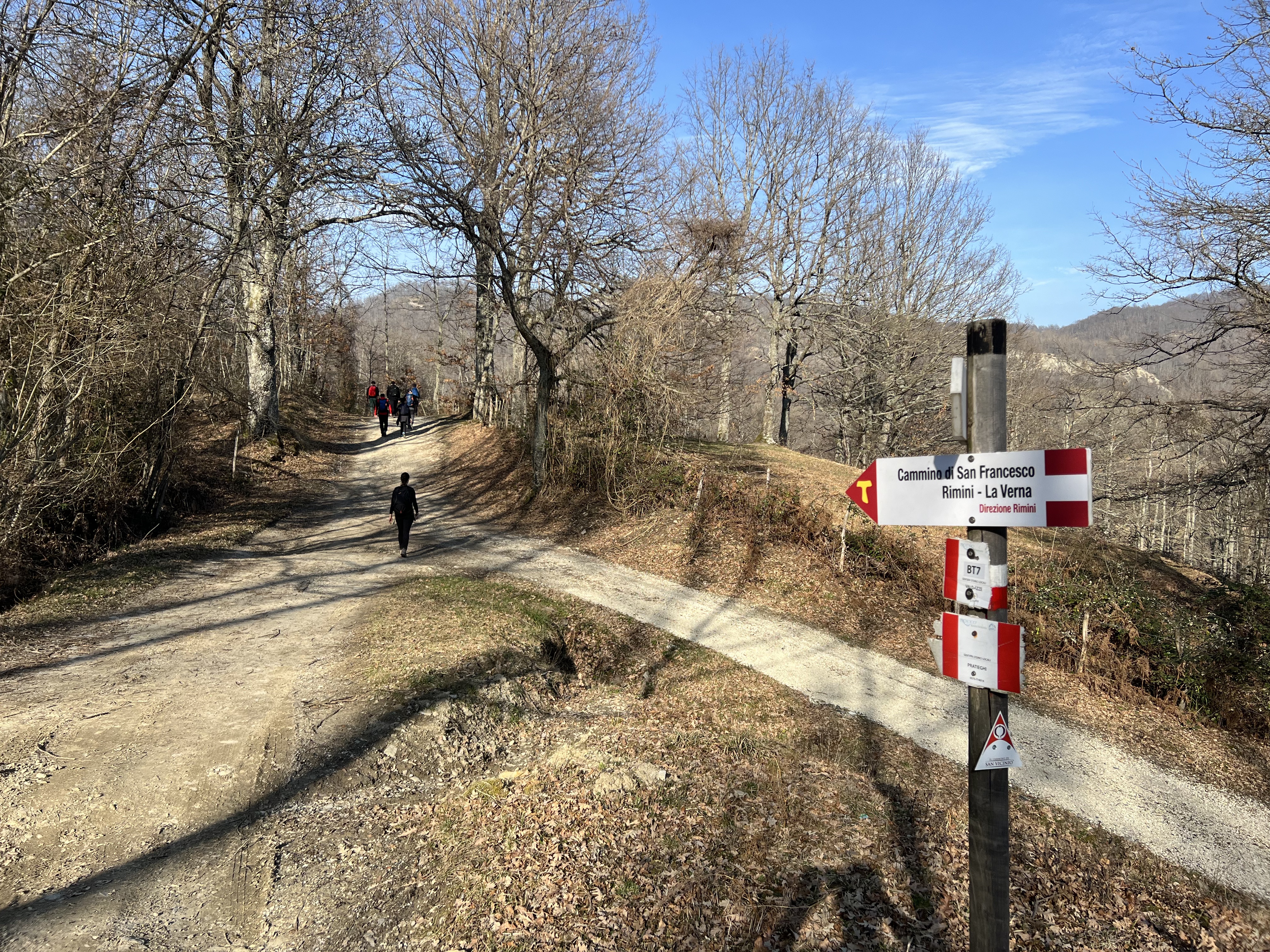 Tornando al percorso, dopo la cappellina del paese si tiene la sinistra, si supera la piazza e si prosegue dritto ritrovando i segni bianco-rossi. Questa parte di sentiero che collega Valdazze a Pratieghi è anche un tratto della Via di Francesco che unisce Rimini a La Verna. In poche parole, difficile sbagliarsi.