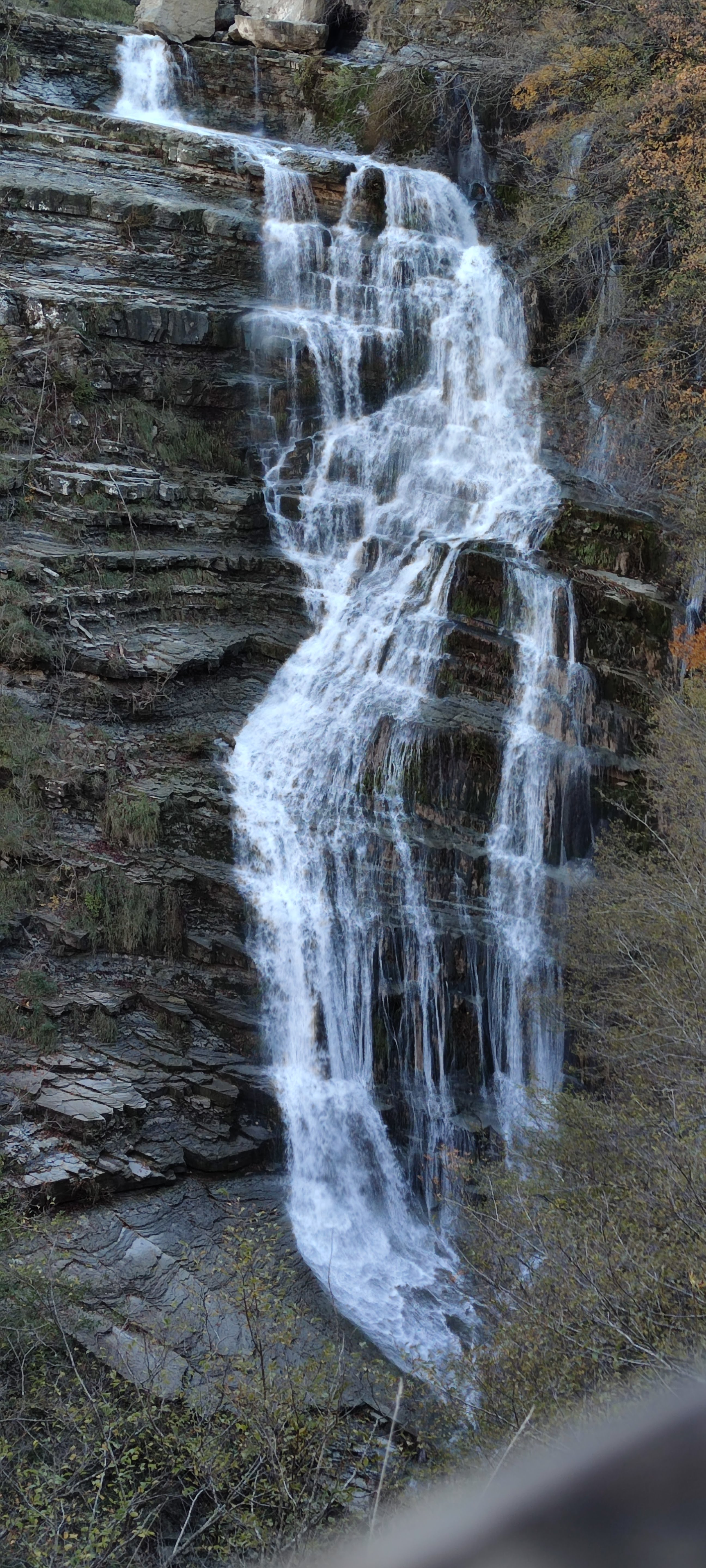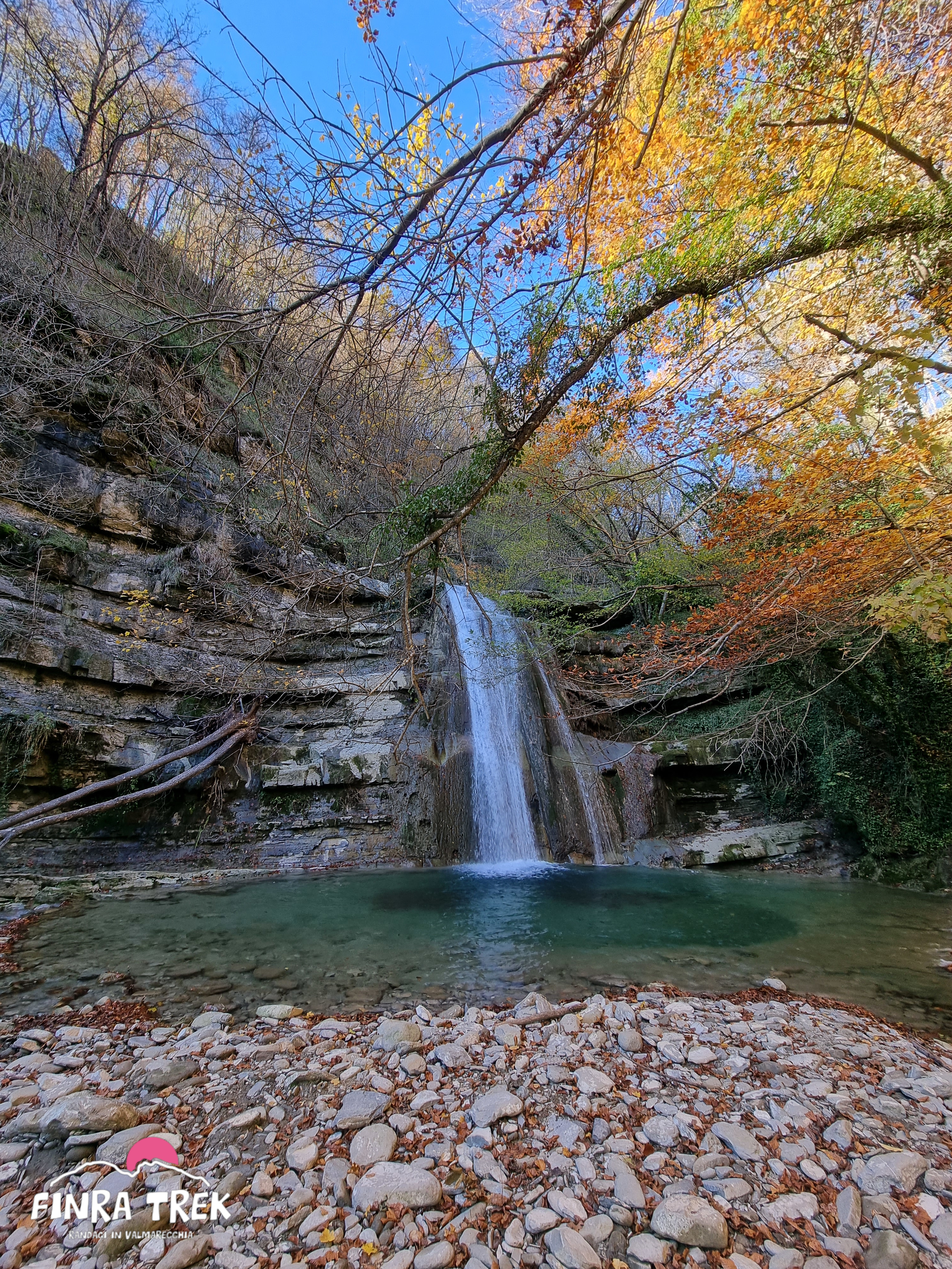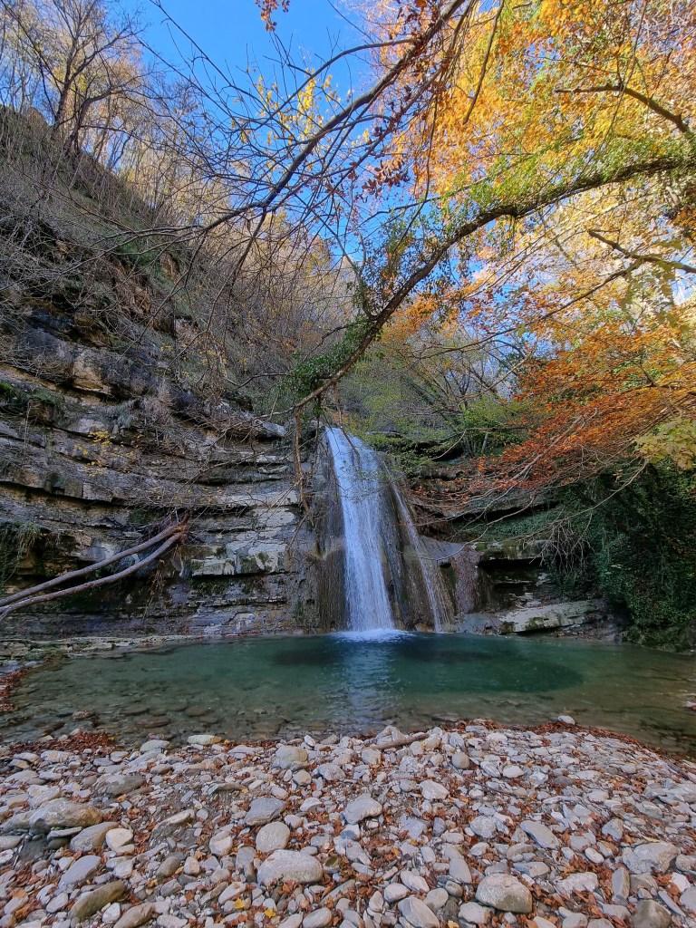 Riprendendo il sentiero sull’altra sponda del fiume, a circa un centinaio di metri di distanza dal Lavane, raggiungiamo il belvedere da cui ammirare cascata Dantesca: 70 metri di pura bellezza. L’acqua cade dirompente nel torrente, diramandosi sui gradoni rocciosi e creando tanti piccoli salti d’acqua che danzano sulla parete.